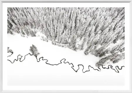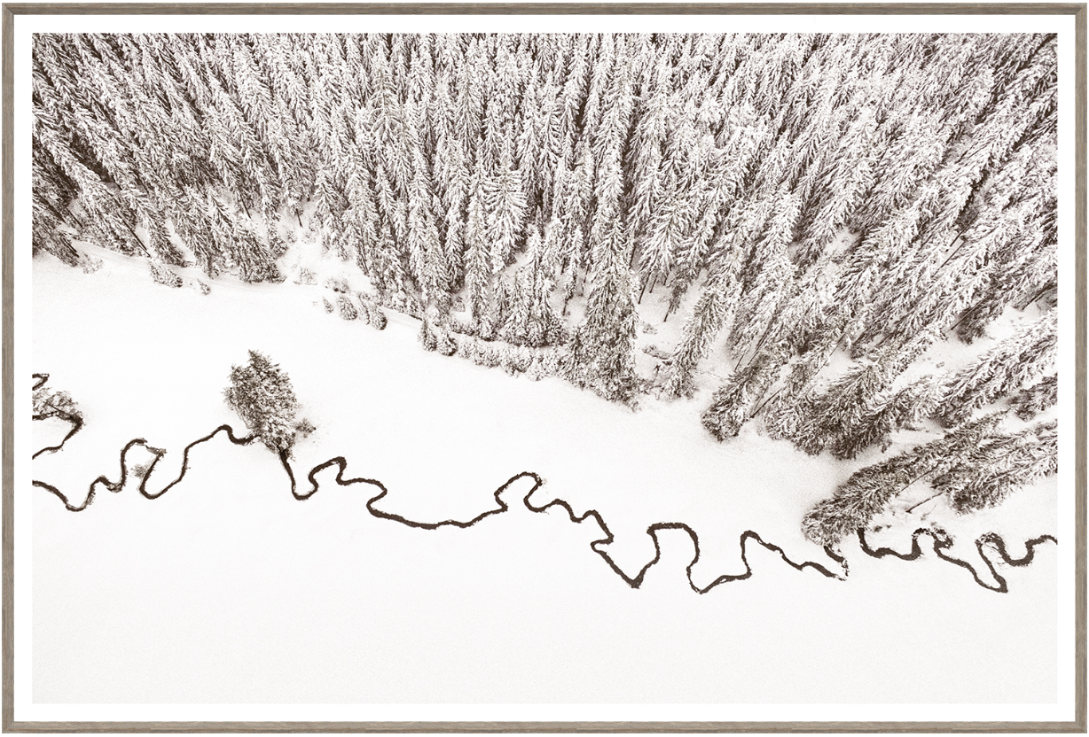 A beautifully simple aerial photograph. The strong undulating line of a stream is contrasted against open, snow-covered space and the texture of tall spruce trees. Cleanly framed in an angled white profile. One of two images available.