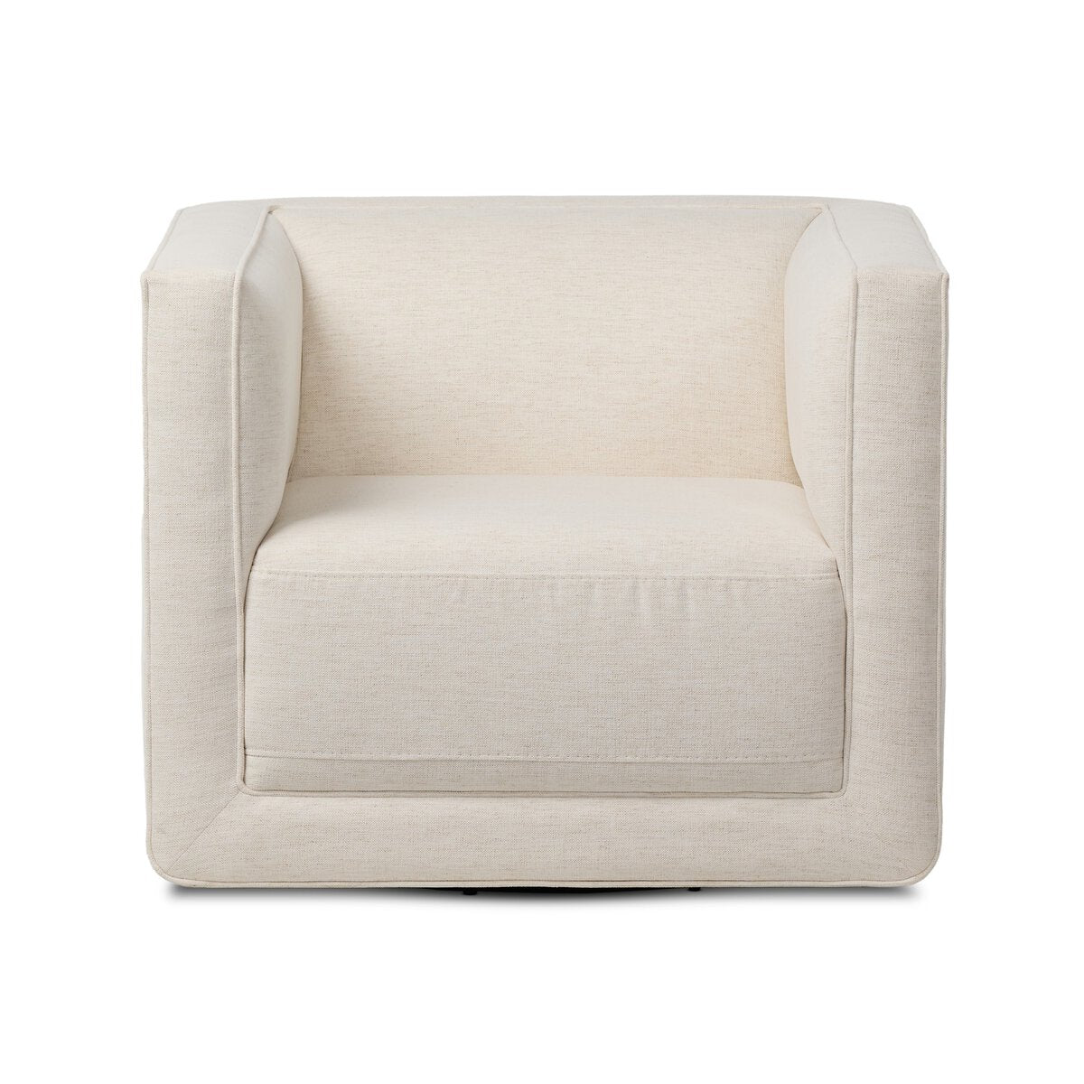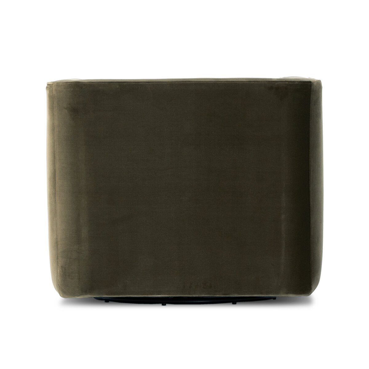 Style meets substance in this olive cotton-blend swivel chair. Blind stitching along the seat and back cushions create a polished complement to the heritage frame. The slight pronounced seat cushion creates an illusion of being loose, but is actually a fixed cushion with expert tailoring. A piping channel detail gives the arm a finished look.