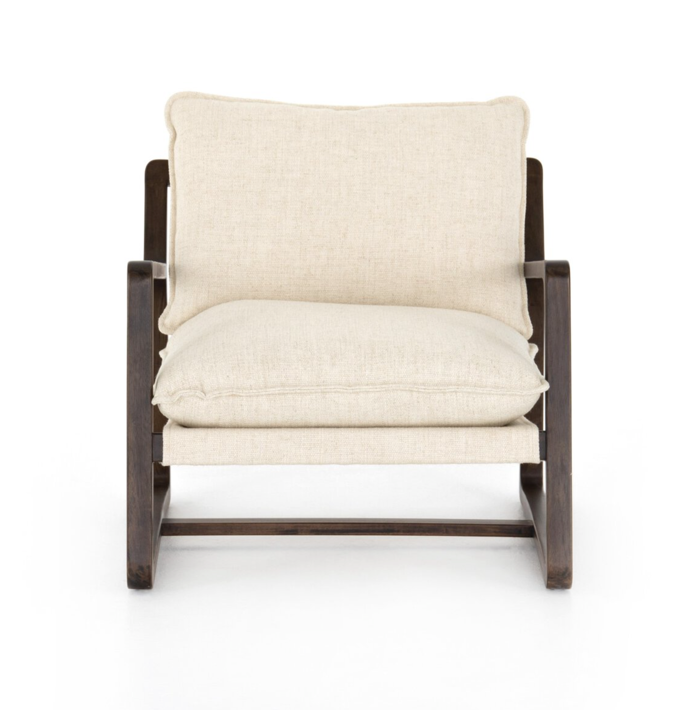The perfect place to curl up with a good book. A hand-shaped parawood frame supports deep, low seating covered in soft, olive-colored cotton. Fabric features subtle highs and lows that change in appearance depending on the direction of the fabric's nap.
