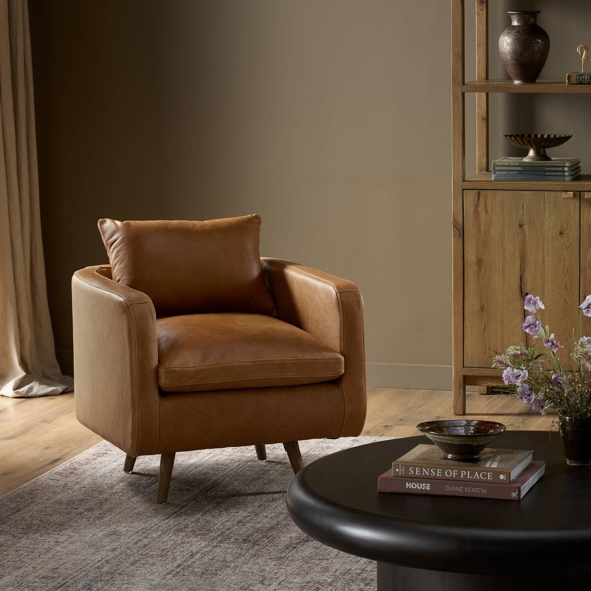 Angled to perfection, atop a 360-degree swivel. Tobacco-finished top-grain leather meet tapered parawood legs, which have been wire-brushed for retro undertones.