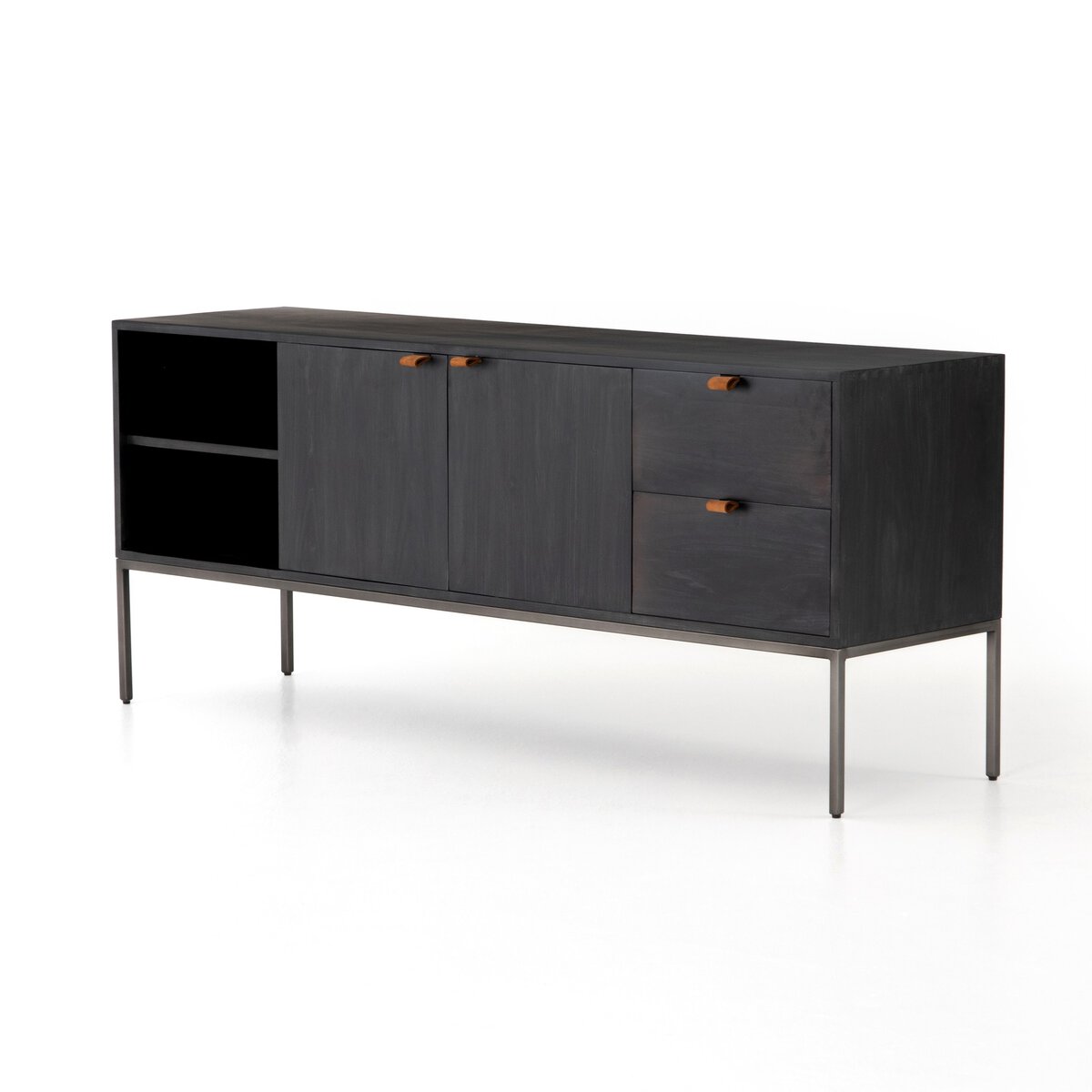 Inspired by sleek mid-century design, a stylish console of black-washed poplar offers ample media storage space by way of open shelving, center cabinetry and spacious dual drawers. Metal-secured pulls of toffee top-grain leather add a textural element of surprise.
