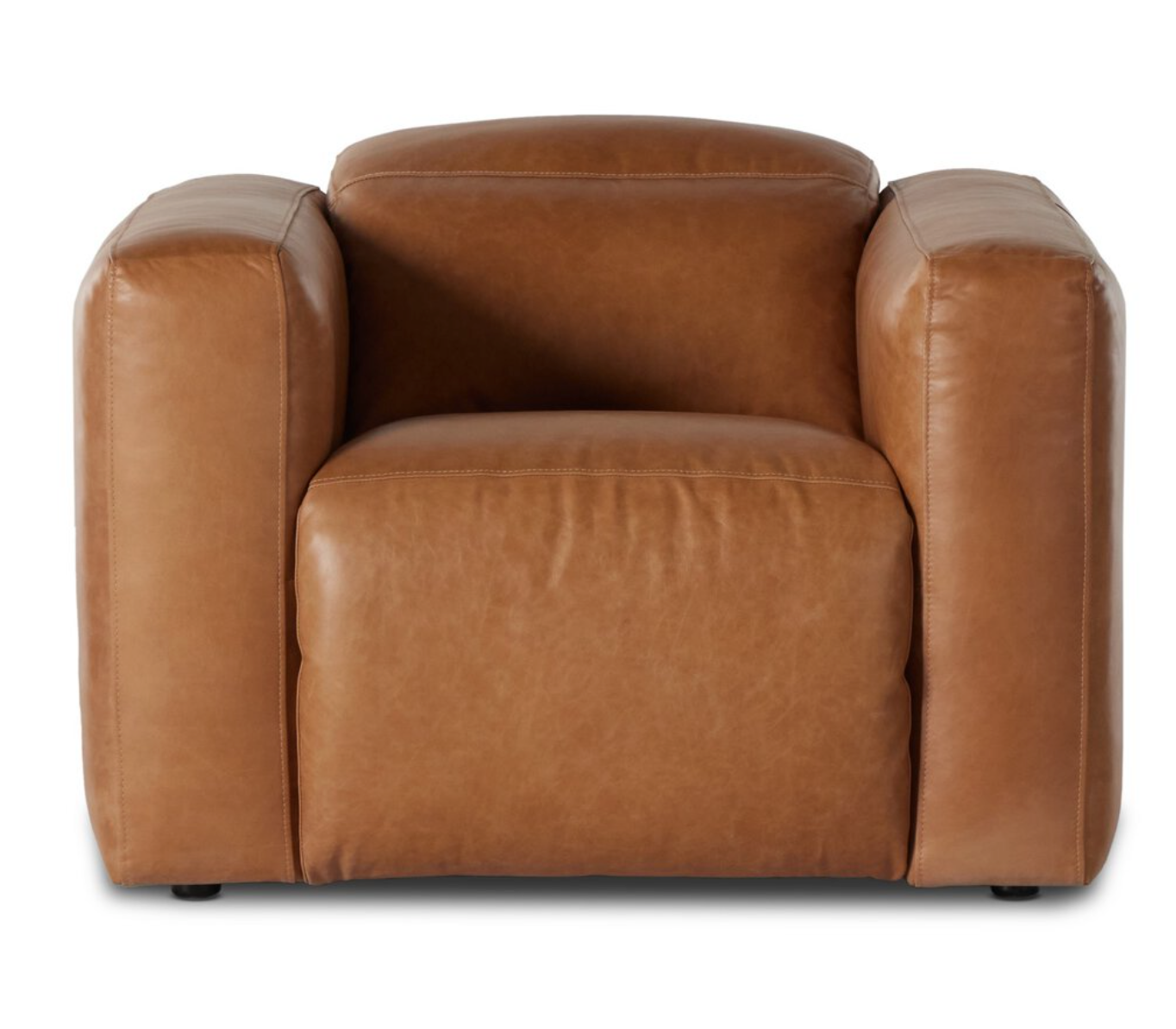 A modern take on the classic recliner. Customize your comfort level with the push of hidden buttons with pieces in our Power Motion collection. Recliner chair features wide arms with a medium to supportive sit and seat height plus an adjustable headrest. Zero-clearance design means the chair can be placed up against a wall. Upholstered in top-grain leather exclusive to Four Hands with slightly distressed character. Includes 9'5" power cord. There is a six-motor maximum per power outlet. Each motor comes with a two-year warranty.