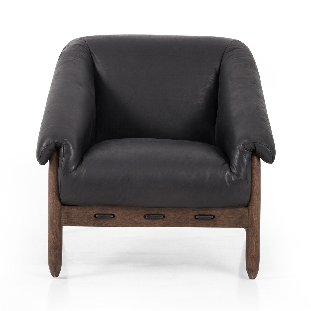 Oversized cushioning brings a Brazilian midcentury feel to this vintage-inspired chair. Designed with cushion-wrapped slanted arms, fixed cushioning with a deep sit and narrow legs reminiscent of midcentury style. Sourced from one of the oldest family-owned tanneries in Italy Bassano del Grappa, heirloom leather is salvaged and processed from upcycled hides featuring an abundance of natural markings, scars and color variations. The result? Beautifully supple, buttery soft hides with an unmatched depth of color and richness, and an authentic lived-in look.