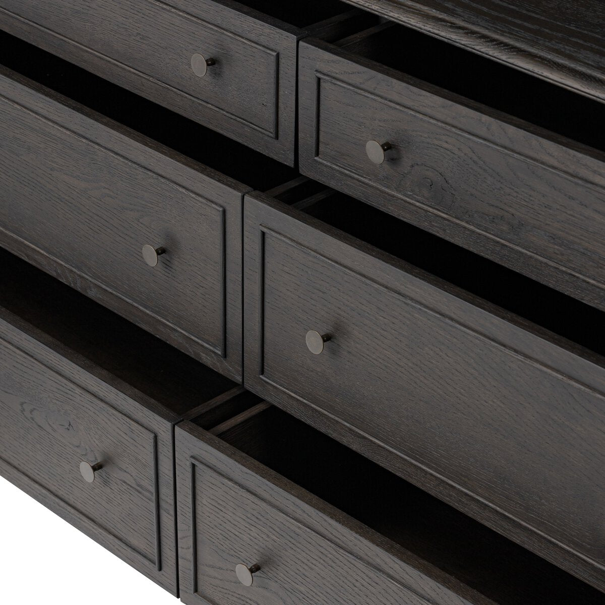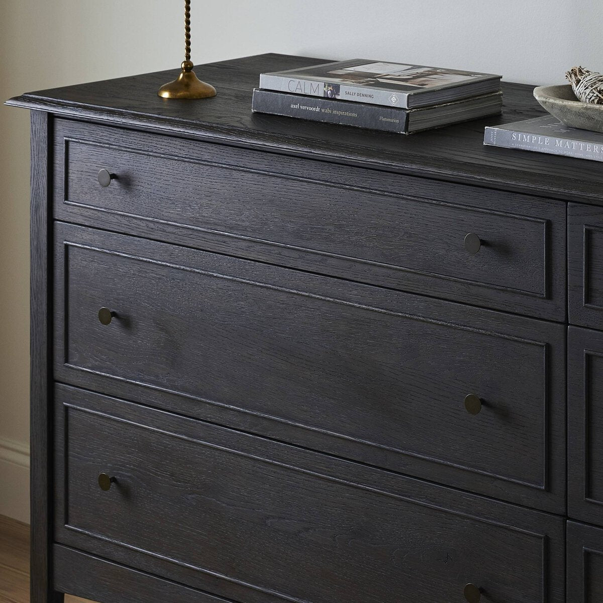 A cleanly shaped six-drawer dresser is crafted from smoked black oak, highlighting the wood's natural grain. Roomy drawers offer plenty of space for bedroom storage, while the slim, tapered legs give the piece a subtle lift, creating a grounded look.