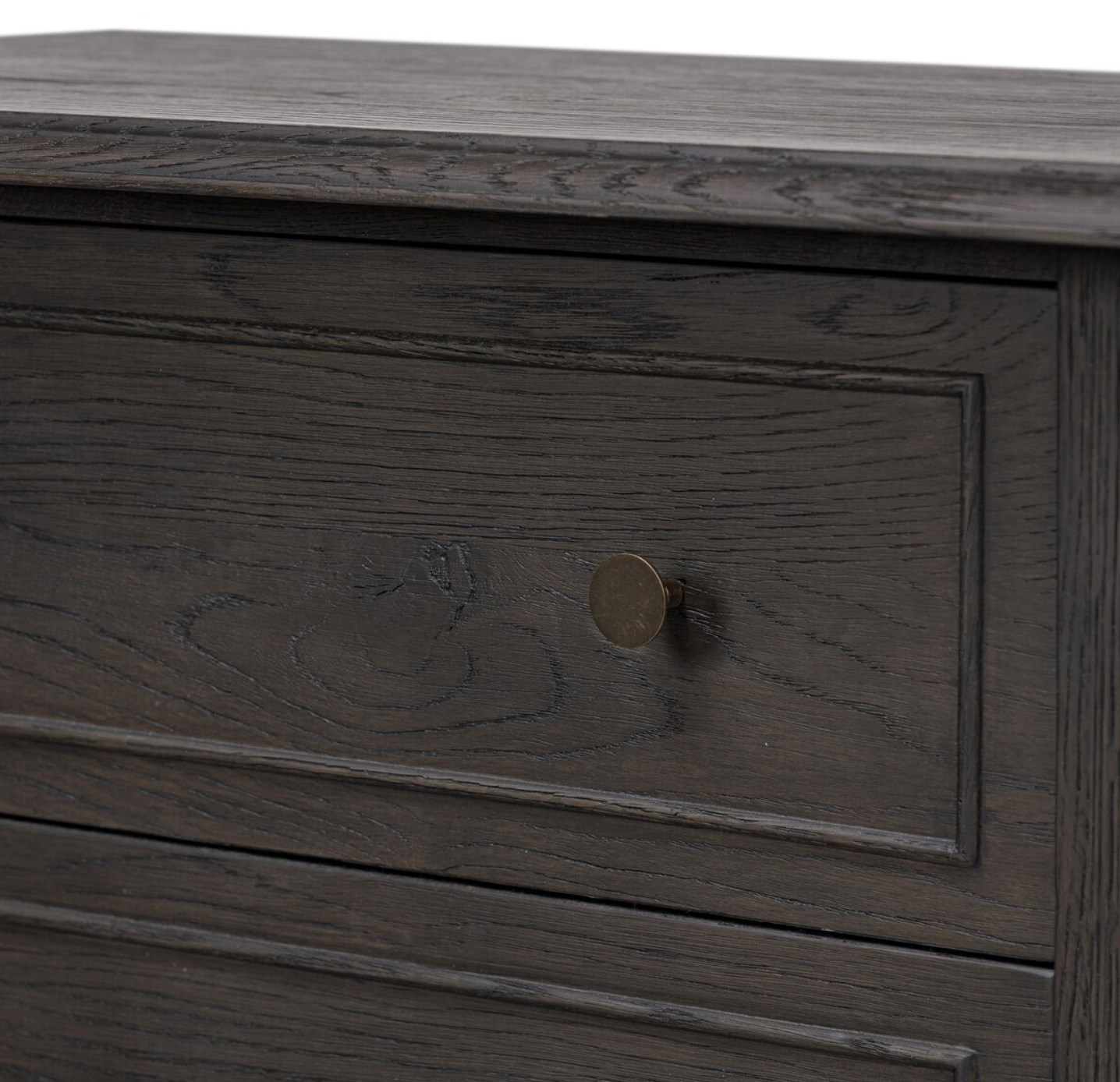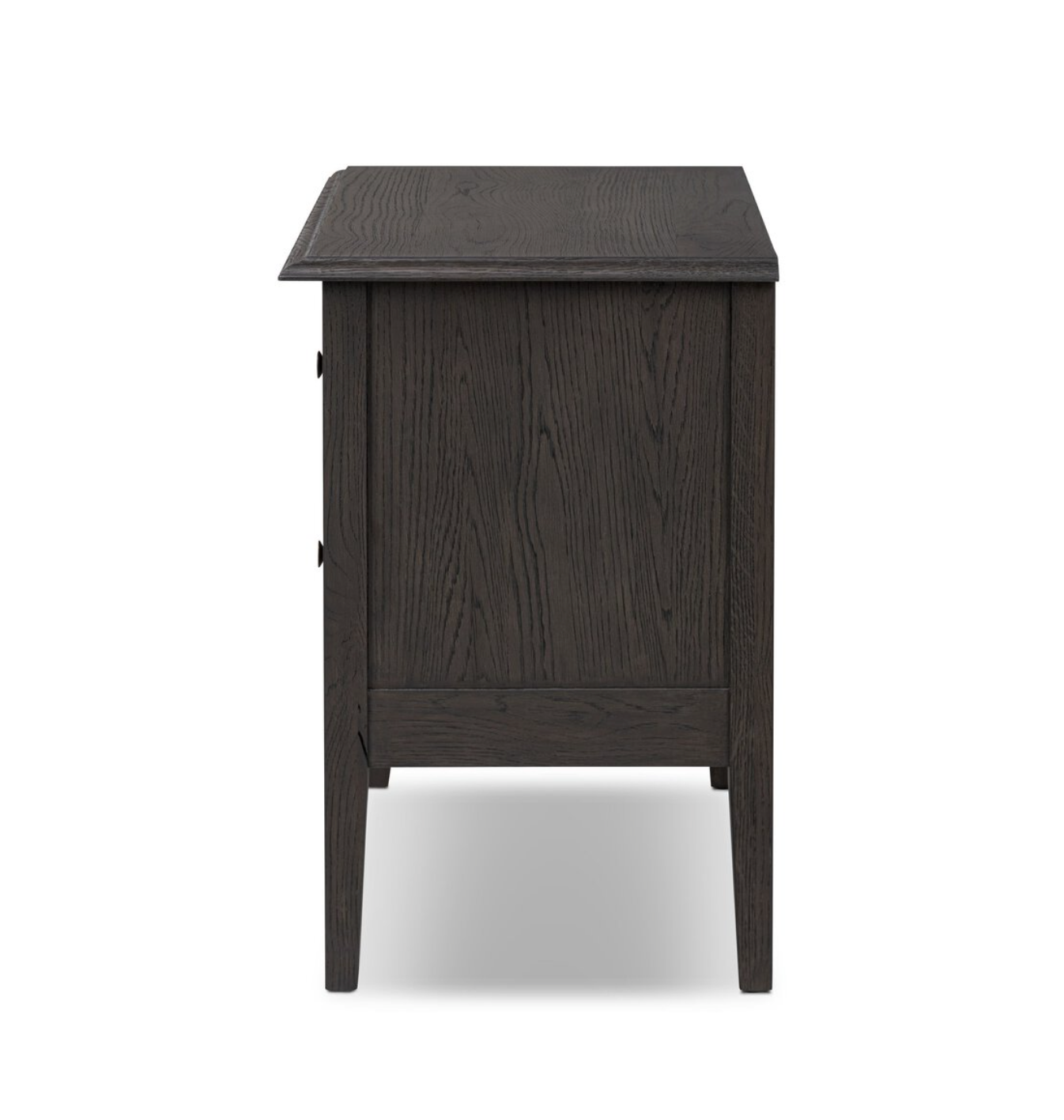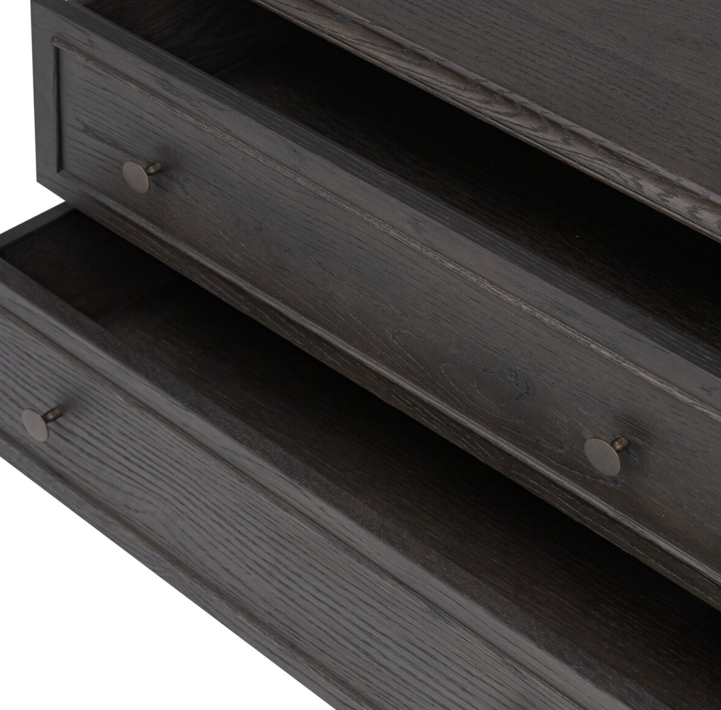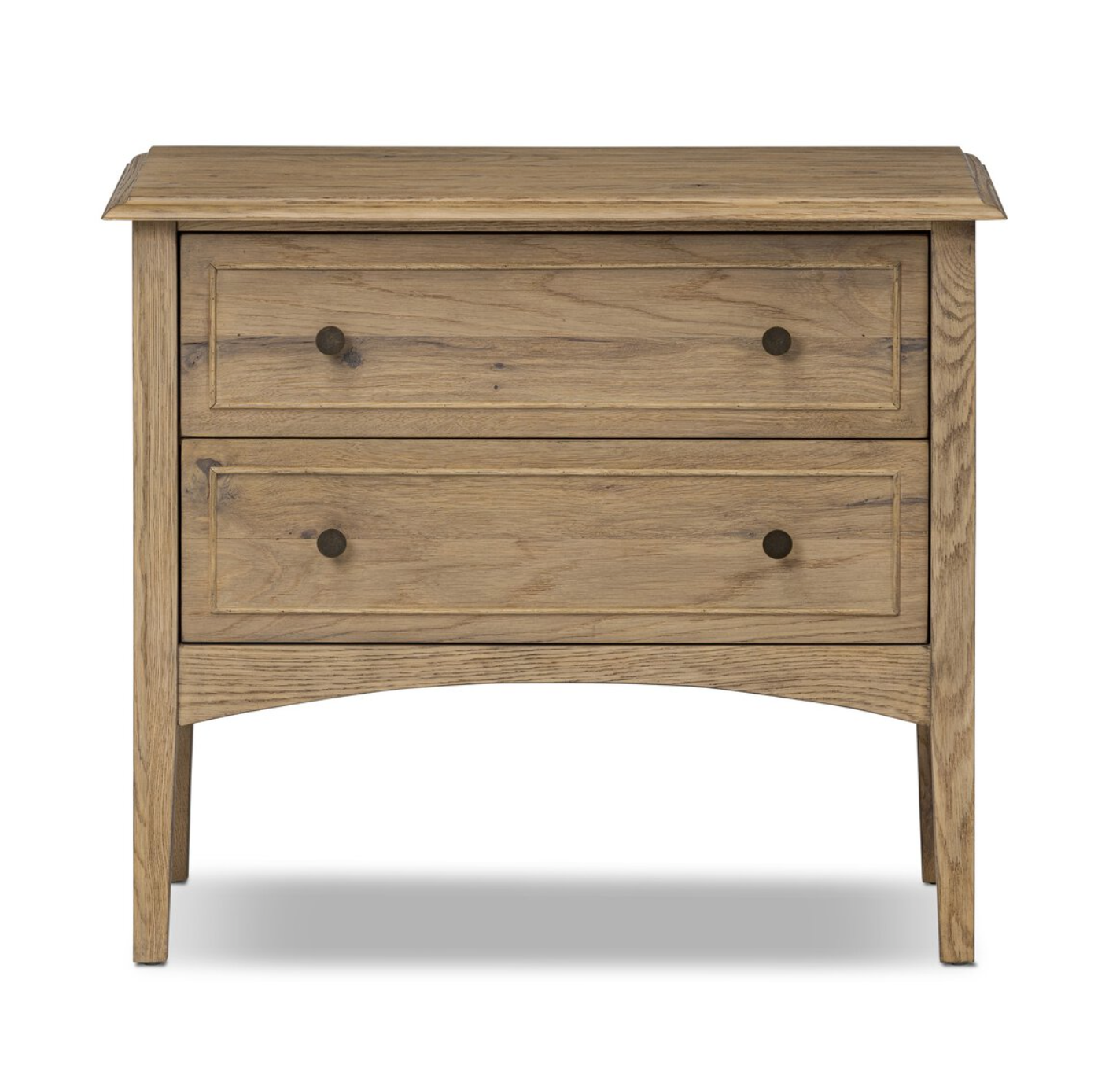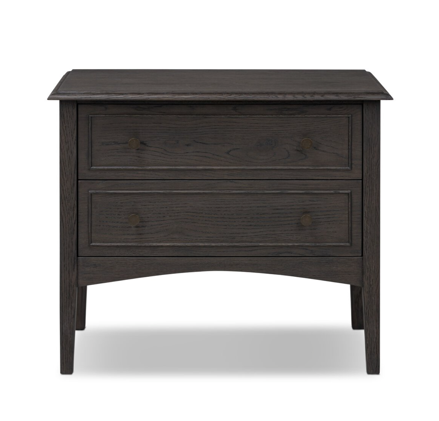 Work a traditional look into your bedroom styling with a nightstand of aged smoked oak, featuring beautiful natural wood graining. Dual drawers bring storage space to your bedside, while an airy base grounds this timeless bedroom style.