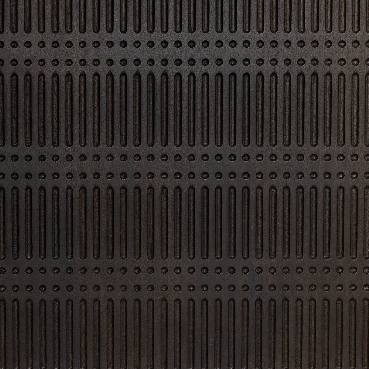 Uniquely carved mango wood is finished in a vintage brown, highlighting texture and craftsmanship, paired with a slim iron base for an airy, cage-like look.