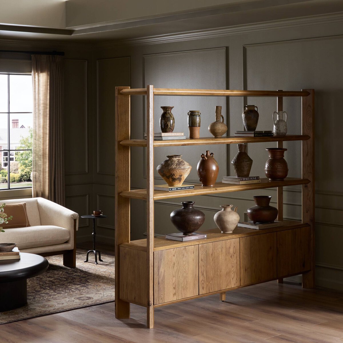 A stunner from every angle. Crafted from a mix of solid oak and thick oak veneer, this overscale bookcase features chamfered edges along the shelves and angled outer legs for lots of movement. Finished in a smoked black oak.