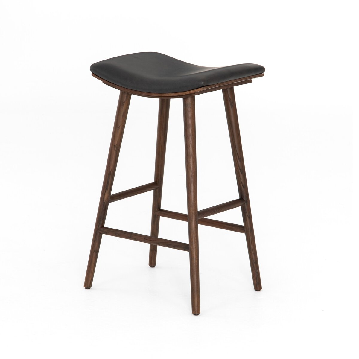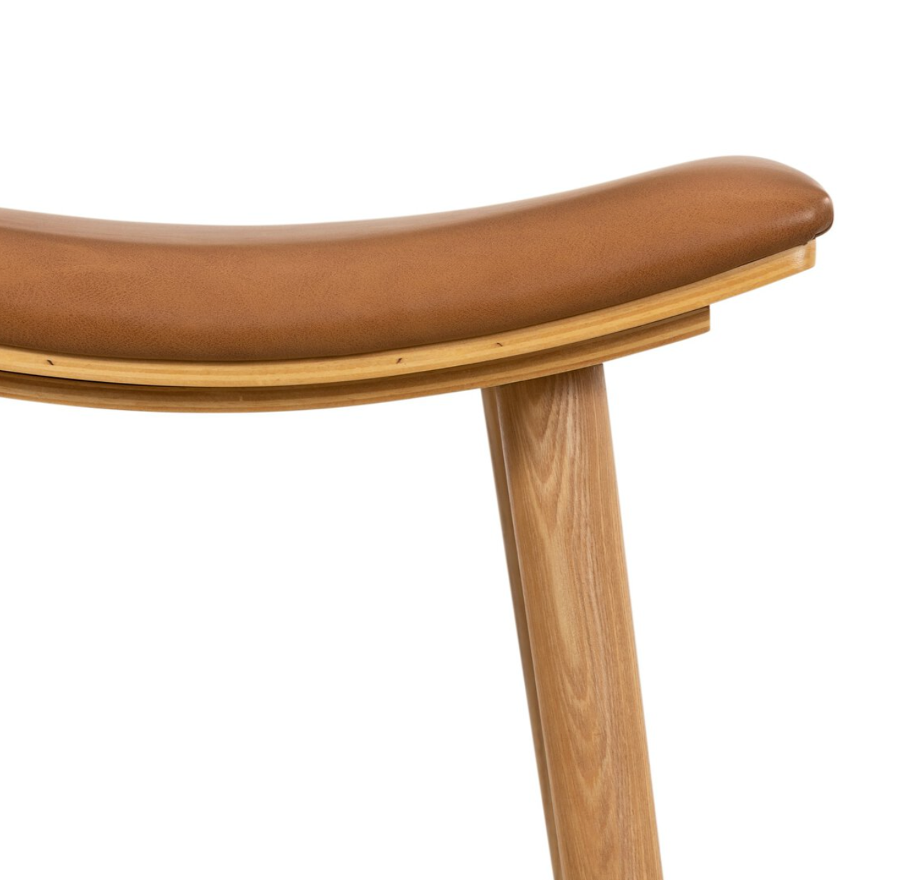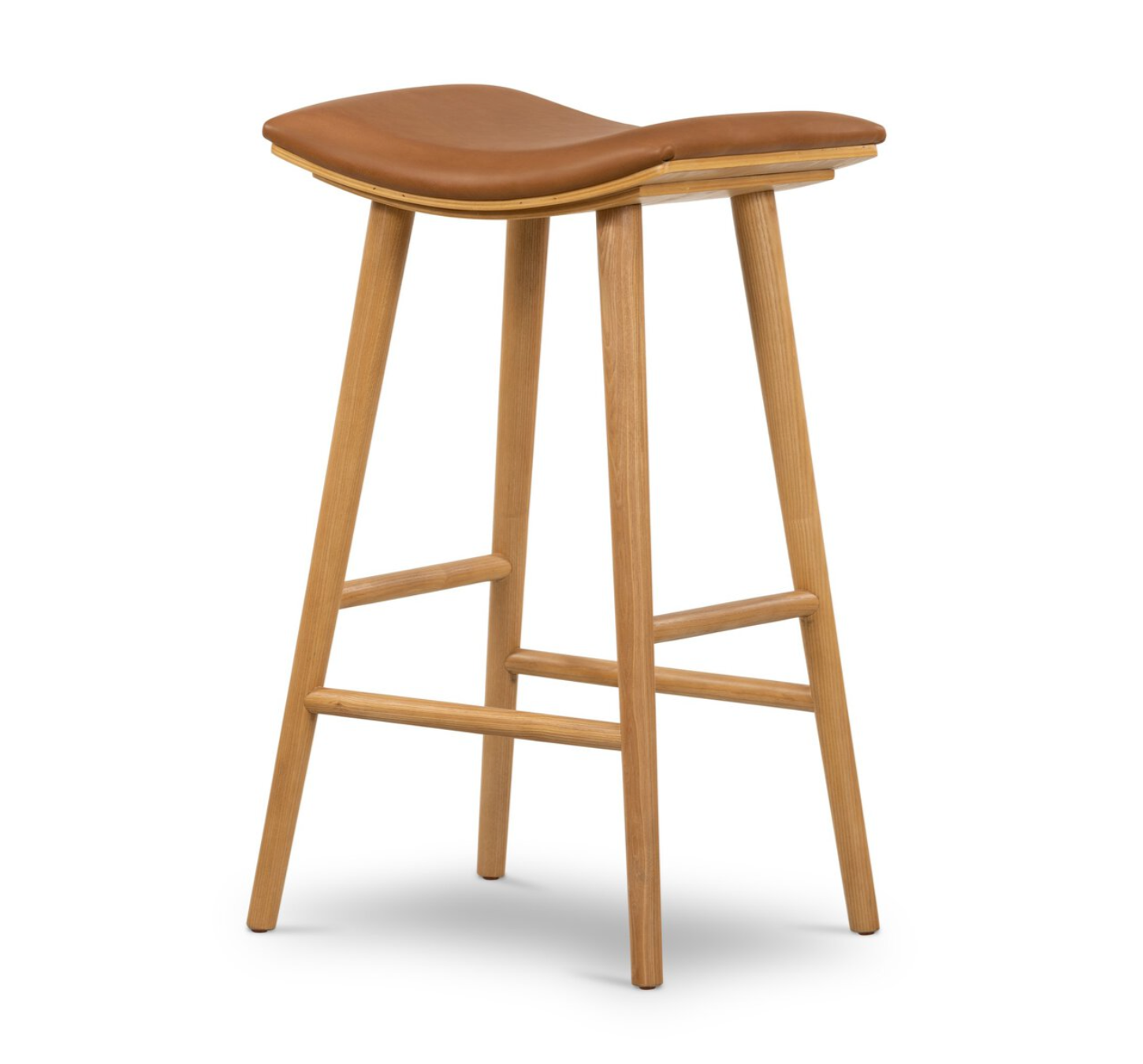 Slim styling meets color contrast for effortless impact. Warm ash framing supports a saddle-style seat of distressed black faux leather.