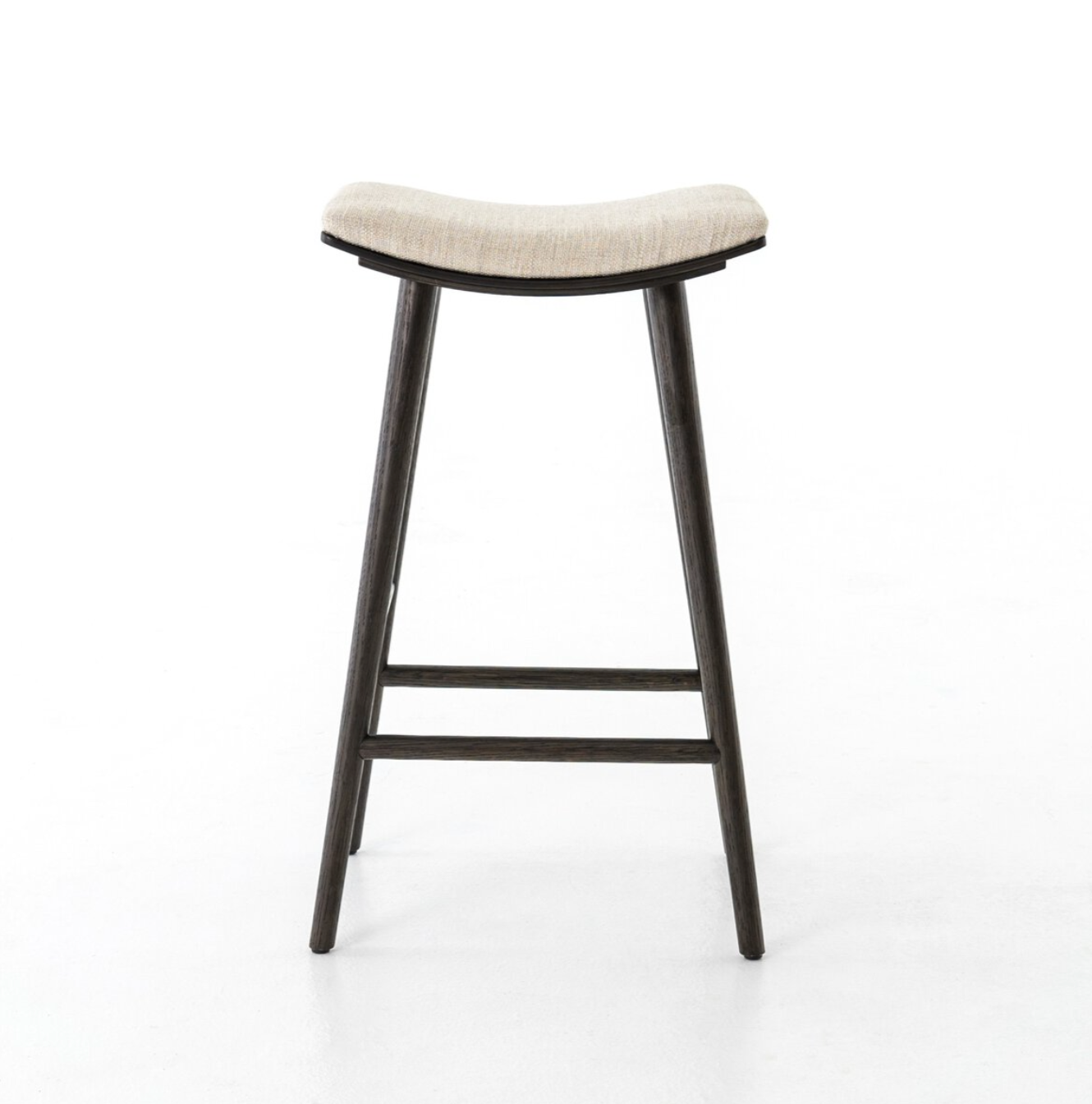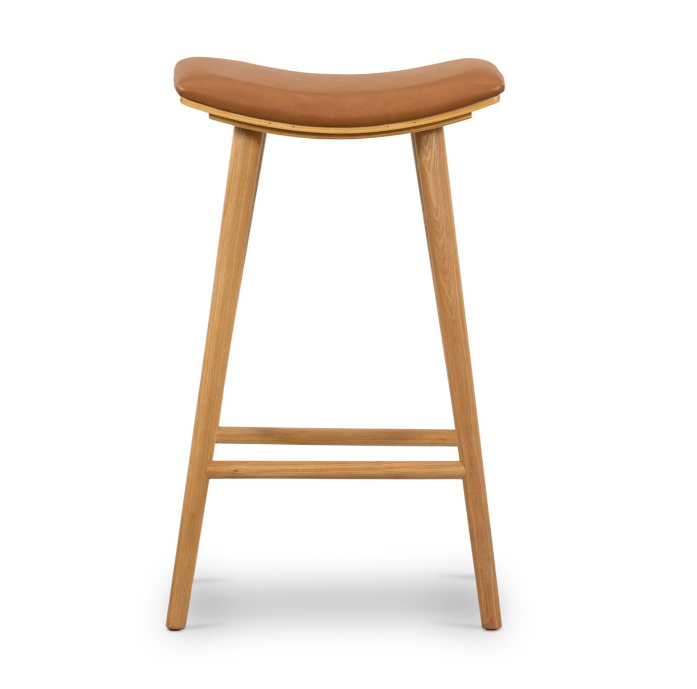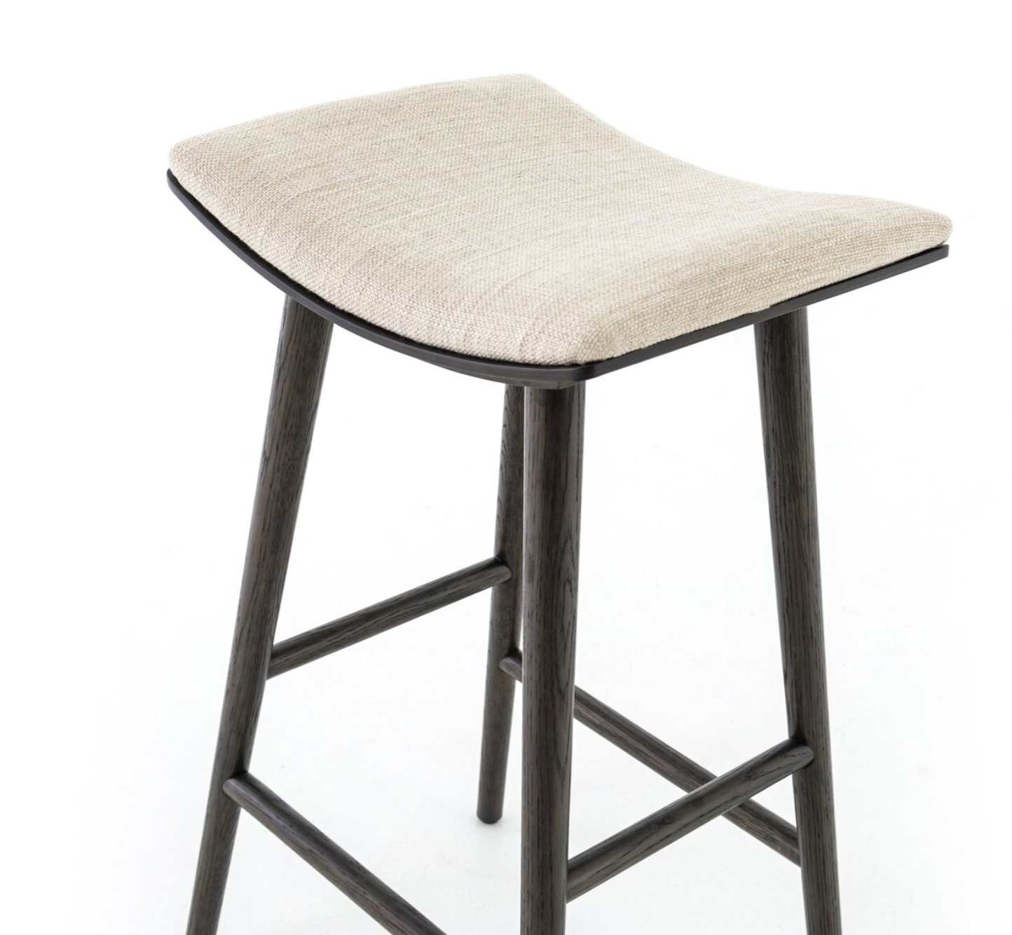 Slim styling meets color contrast for effortless impact. Warm ash framing supports a saddle-style seat of distressed black faux leather.