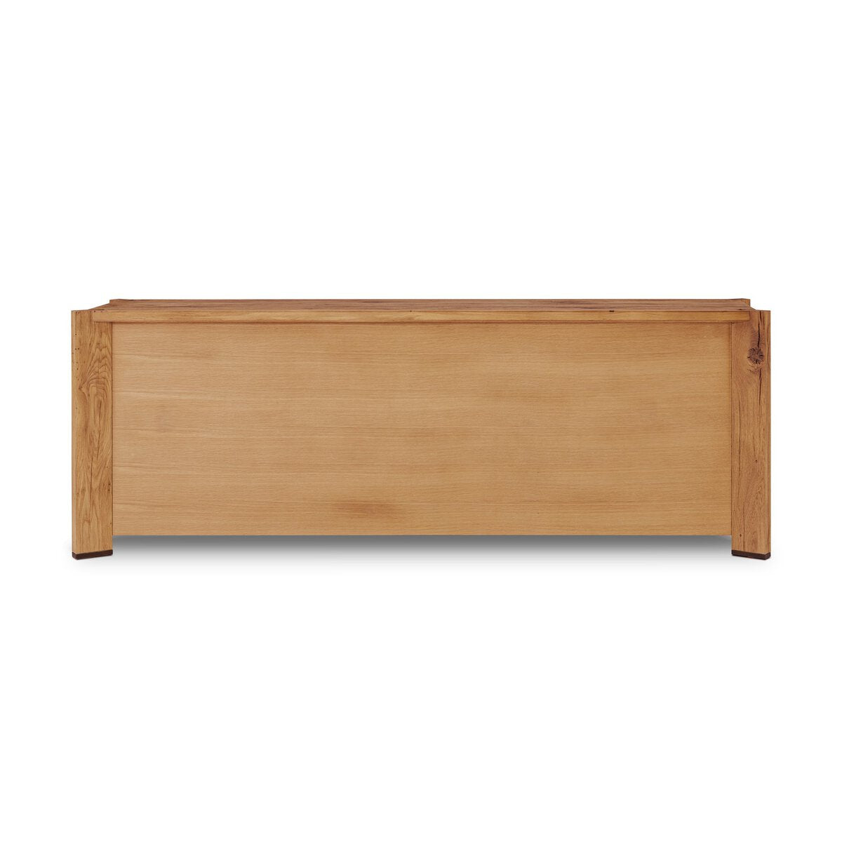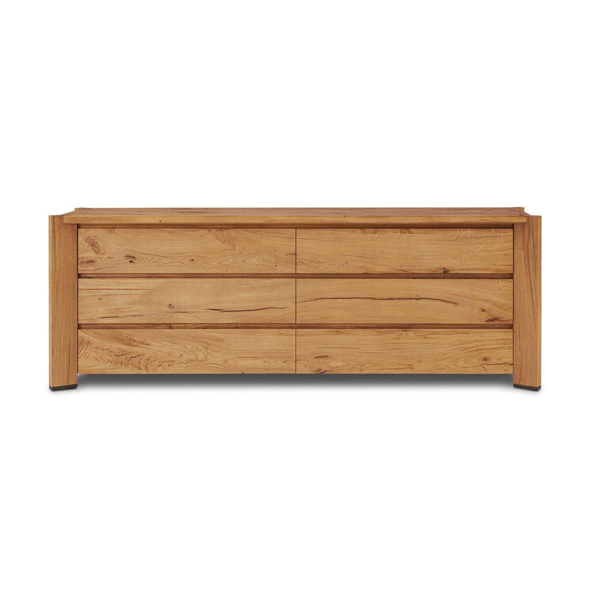 Designed by Thomas Bina and Ronald Sasson, a design partnership blending both modern minimalist and Brazilian influences. This grand-scale dresser is crafted from natural reclaimed French oak with plenty of graining, cracking and movement across the drawer fronts. Detailed with angled legs and exposed joinery on the top. Drawers are fully finished on the interior so each piece is beautiful inside and out.