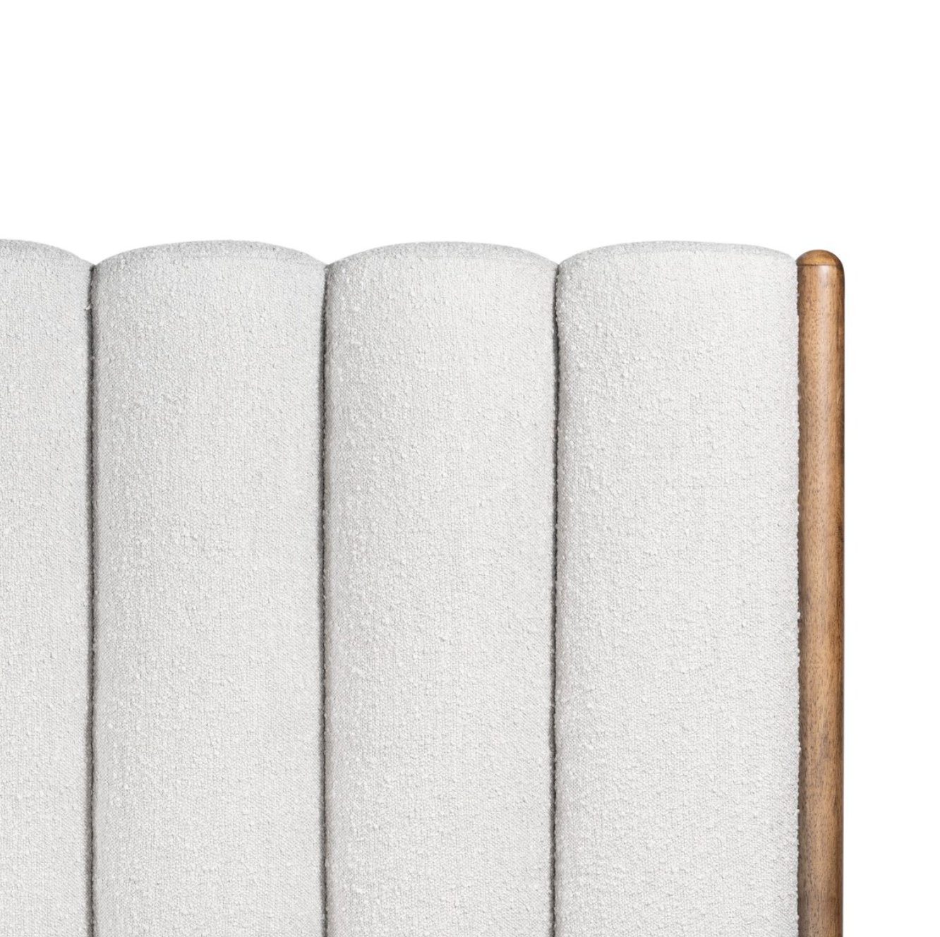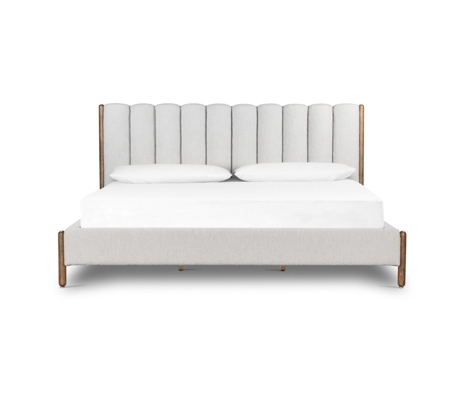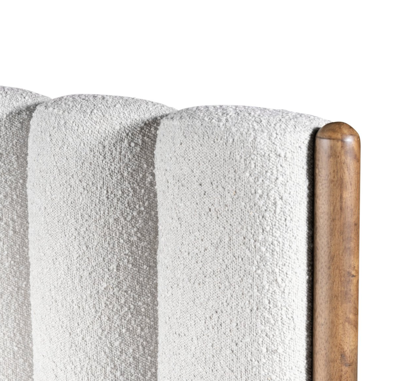 Channel surfing. A lux take on a vintage-inspired style, upholstered with boucle-like fabric in a neutral sand. Parawood legs run the height of a heavily channeled headboard, for a lengthy look with textural depth.