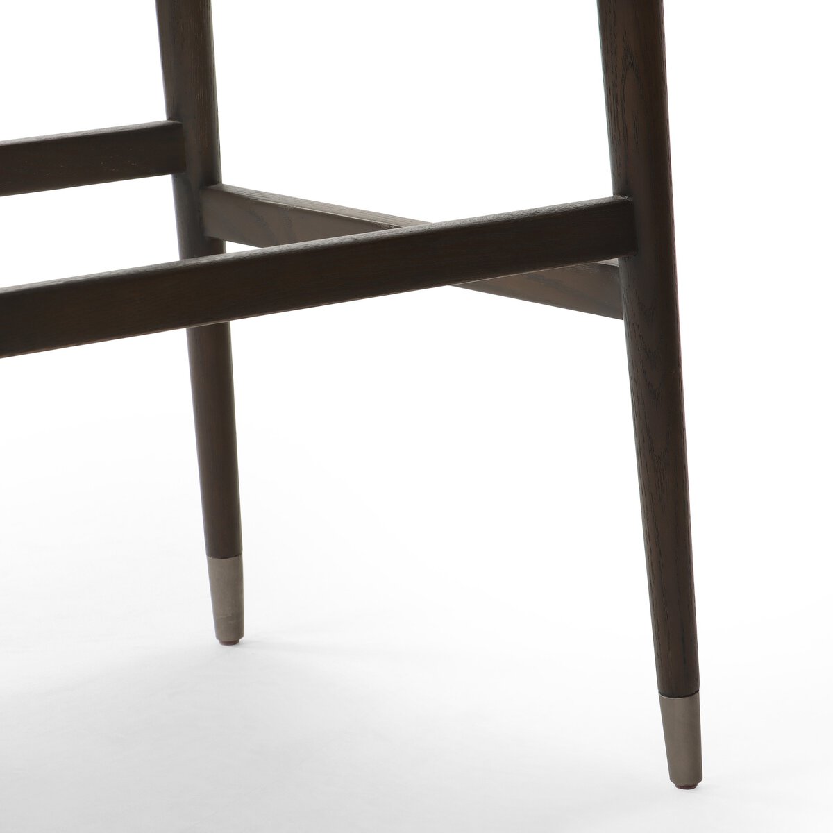 Eighties inspiration gone modern. With iron-dipped caps, tapered legs of solid oak frame this counter stool's seat and back, upholstered in brown top-grain leather. Slim wood stretchers add an airy vibe.