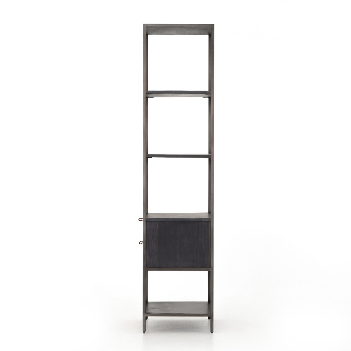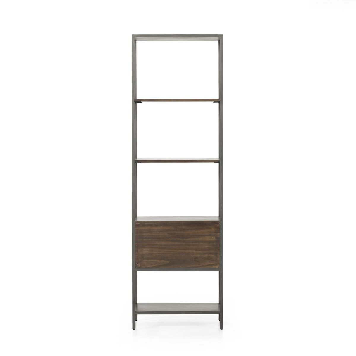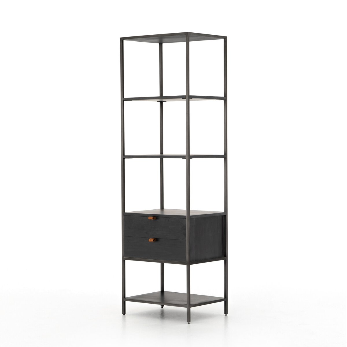 Inspired by clean midcentury design, solid poplar and raw iron fuse to offer storage and display space by way of open shelving and dual drawers. Metal-secured leather pulls add a textural element of surprise. Great alone or doubled and paired with matching media console.