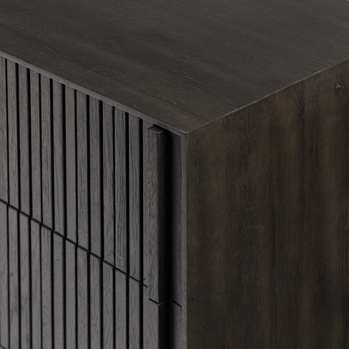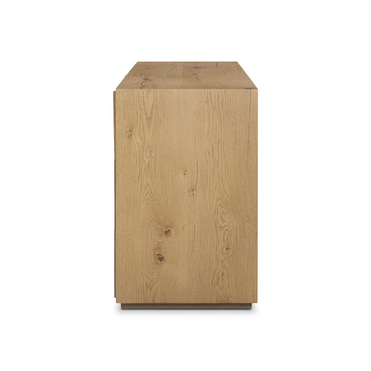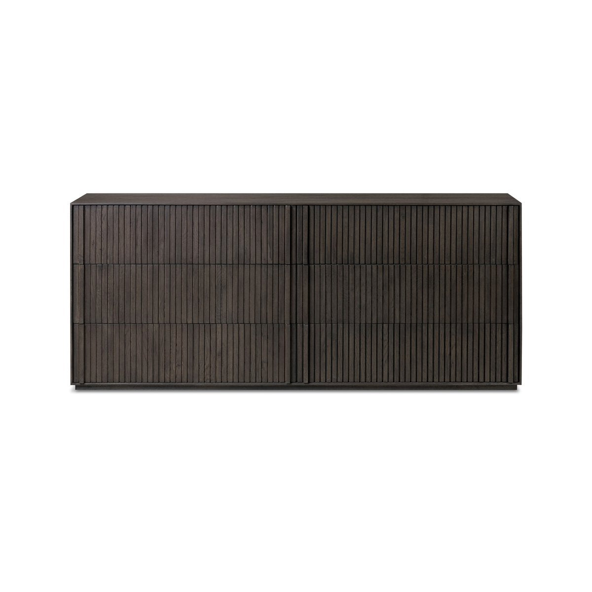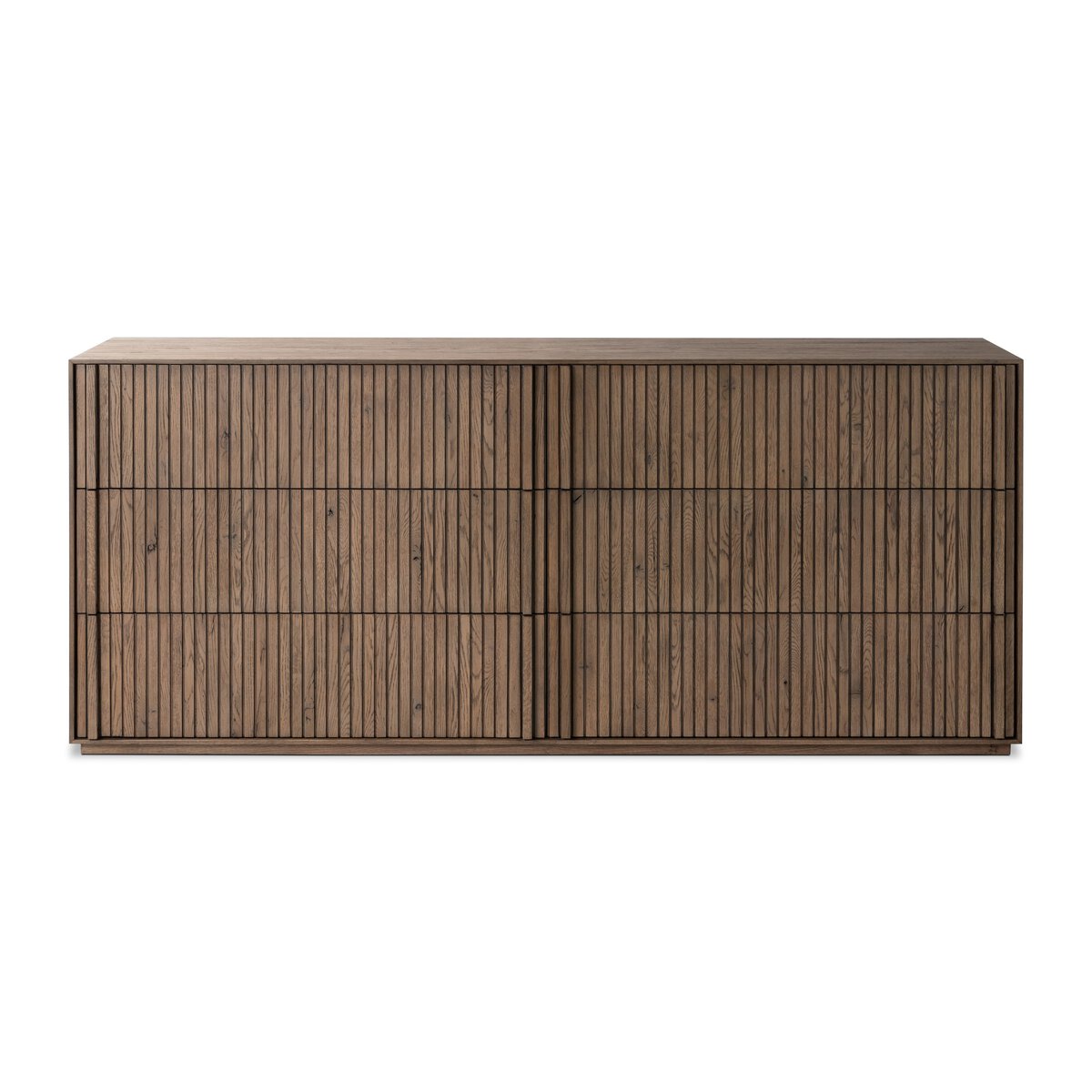 Designed by Thomas Bina and Ronald Sasson, a design partnership blending both modern minimalist and Brazilian influences. Crafted from solid oak, this clean-lined dresser features vertical reed detailing on the drawer fronts with wooden pull detailing on the outer edges. Drawers are finished with soft close under-mount drawer glides.