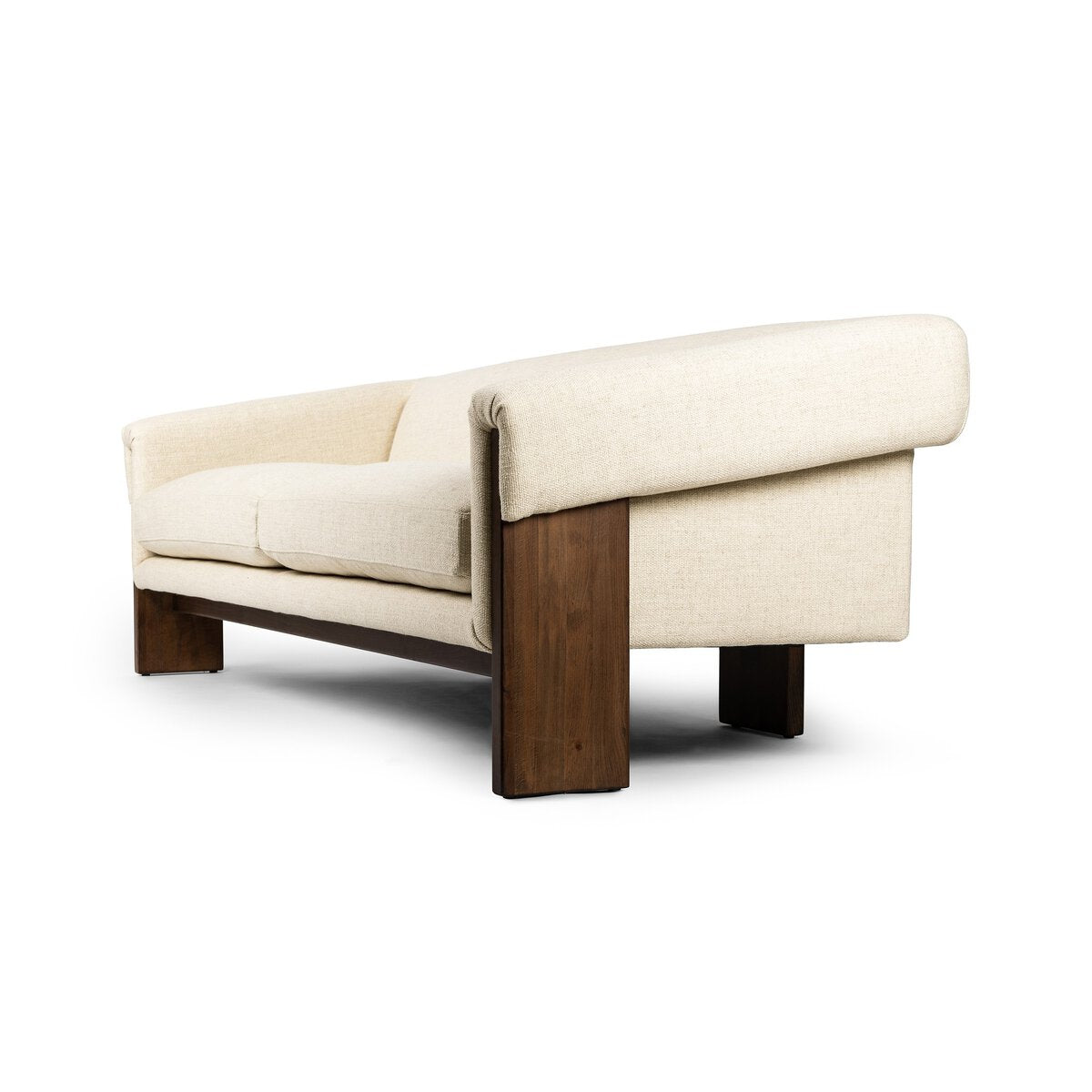 A silhouette that commands attention from all angles. Inspired by vintage Brazilian designs, wide plank legs form an architectural frame for floating cushion seats. Tight upholstered back with wraparound arms and plush feather-blend cushions.