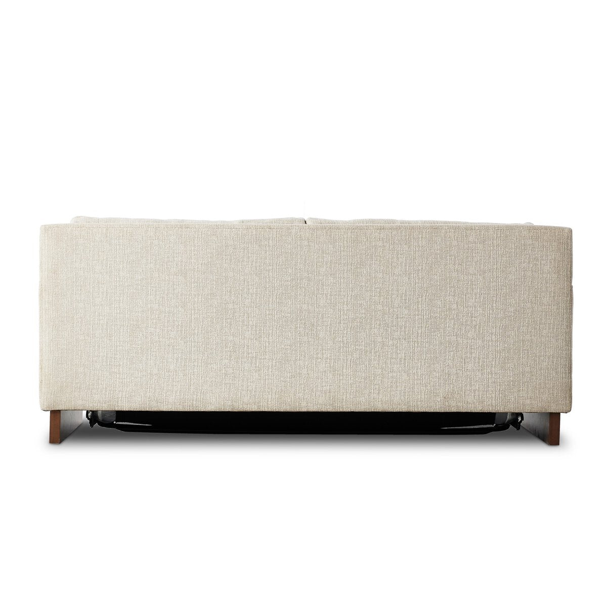 A sleek sofa that doubles as a queen sleeper. Oversized with clean, straight lines, this piece feels comfortable and modern. Padded track arms cradle removable foam and fiber seat and back cushions that can be removed to access the sleeper mechanism. Paired with classic ski legs in cocoa brown and covered in light fabric upholstery, this chair easily blends form and function.