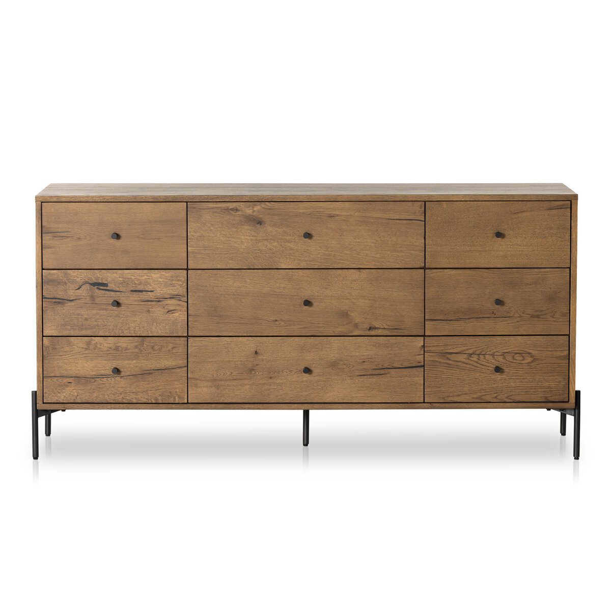Amber-finished oak features nine spacious drawers plus gunmetal-finished hardware, for a rich, clean look that's always in style. Dark resin plays up natural graining for a unique touch.