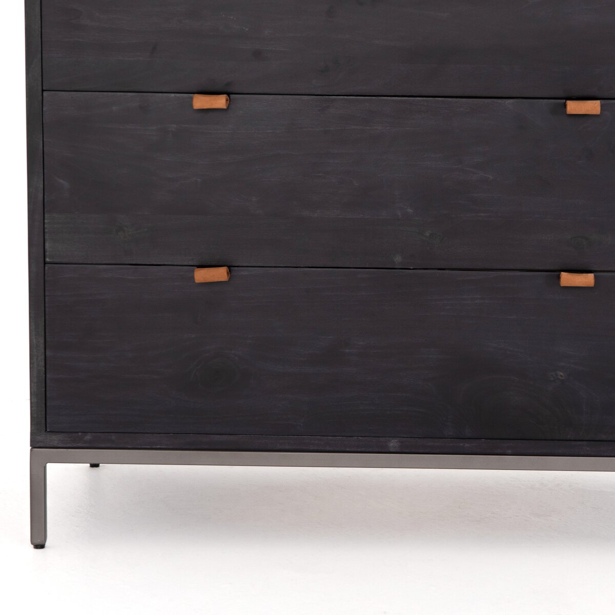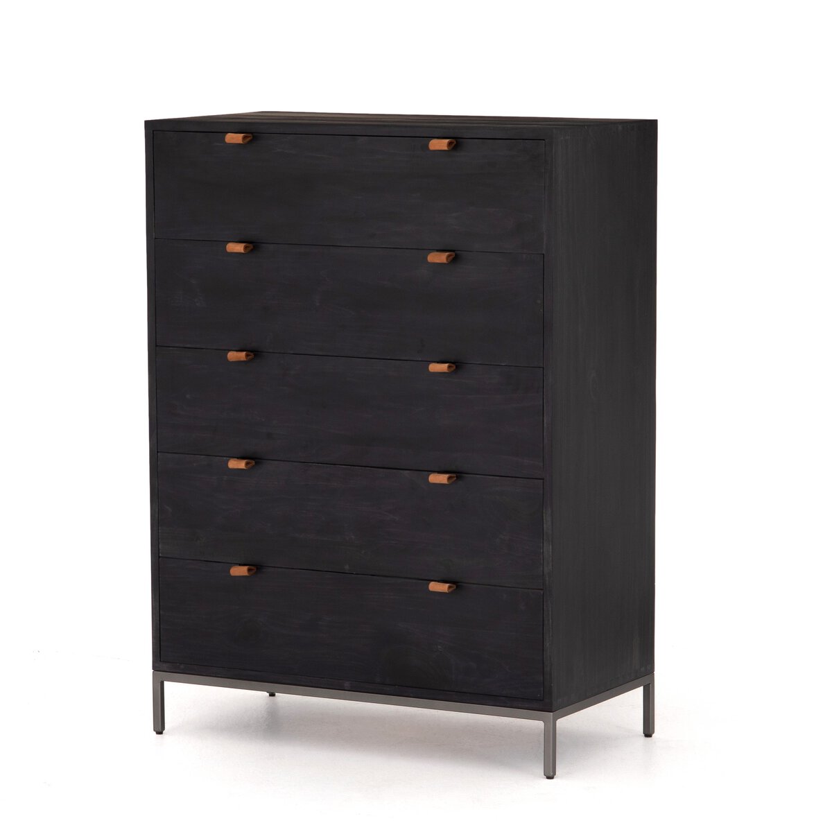 Inspired by clean mid-century design, a stylish dresser of black-washed poplar offers plenty of bedroom storage space thanks to five spacious drawers. Metal-secured leather pulls add a textural element of surprise.