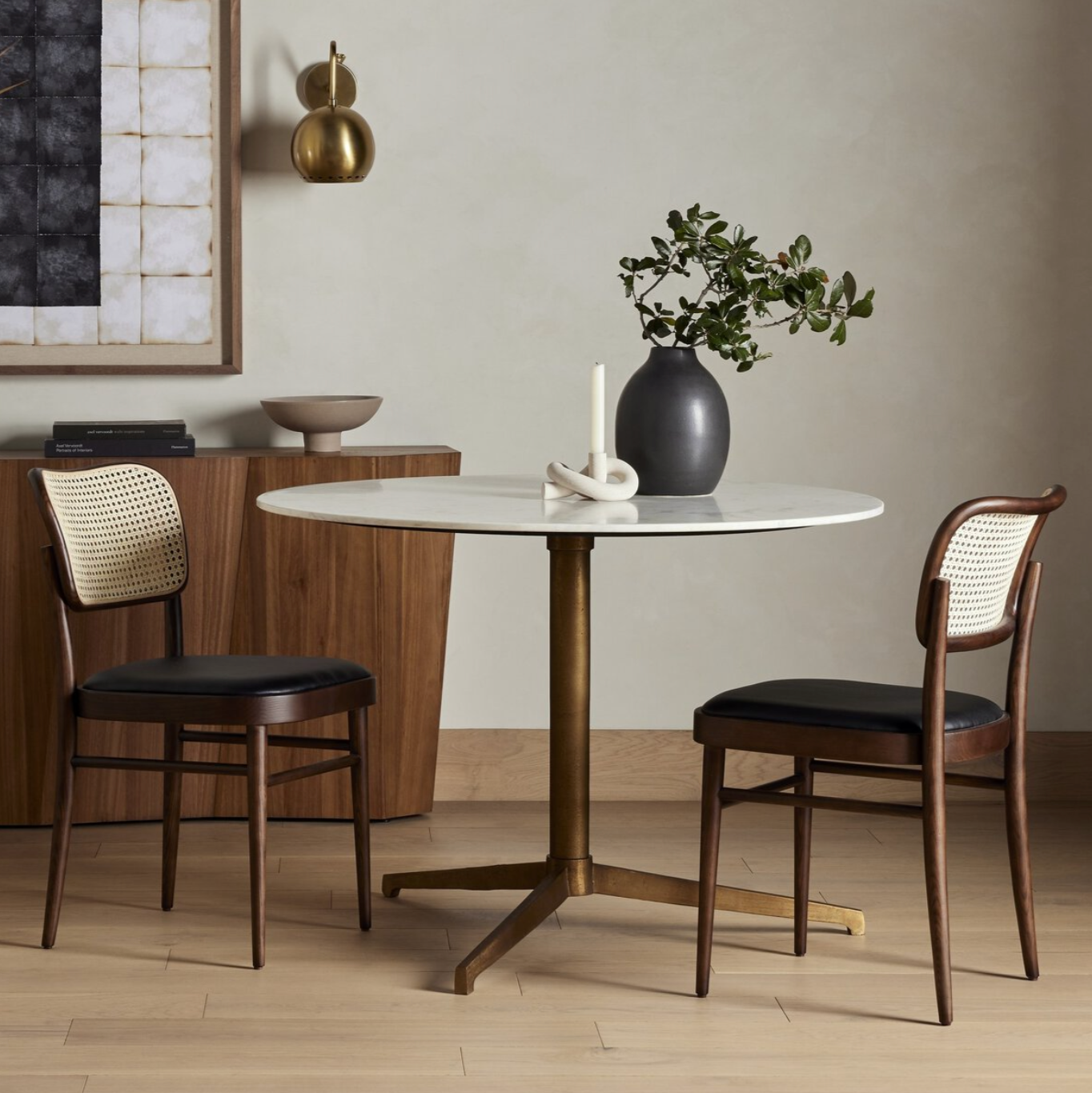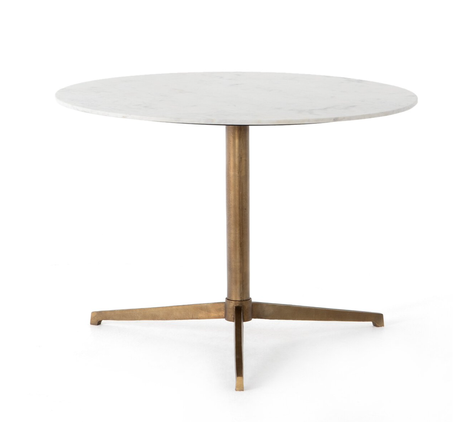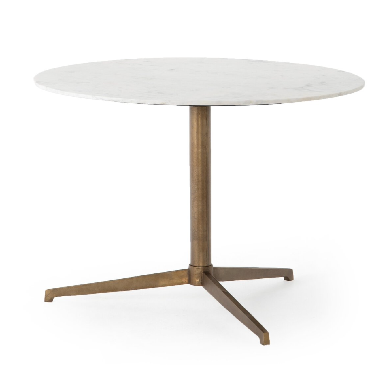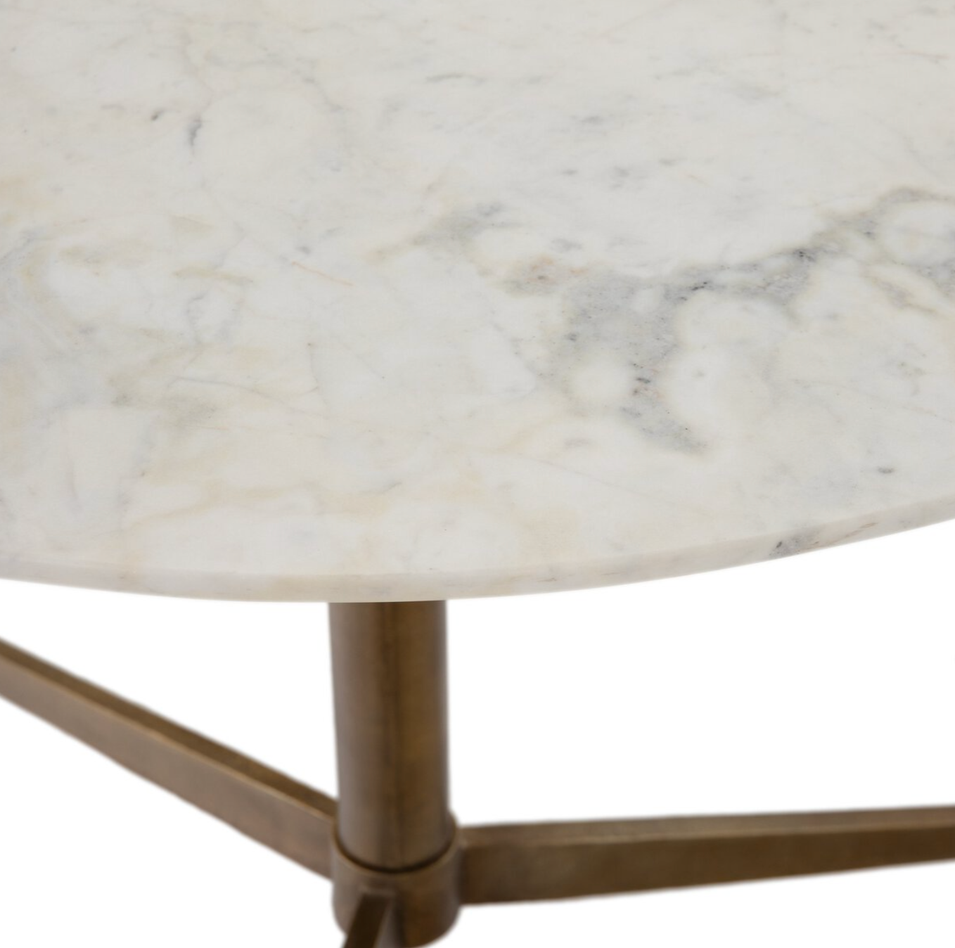 Simple, sophisticated style. A slim tripod base of raw brass supports a rounded tabletop of polished white marble, perfectly scaled for smaller spaces.