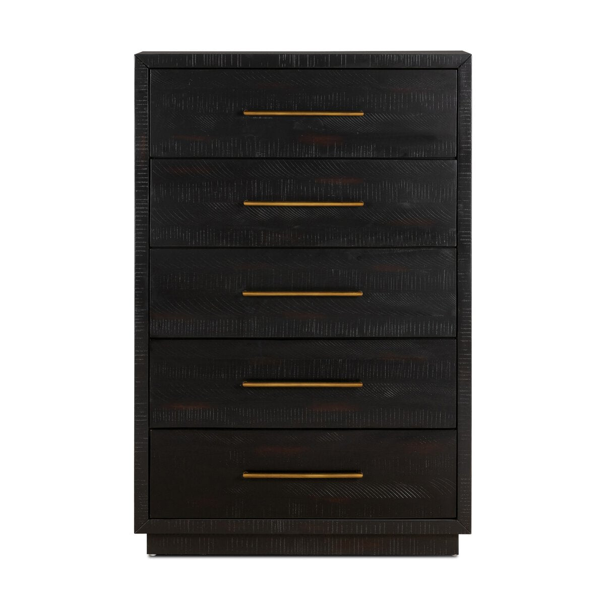 Simple sophistication with a modern edge. Clean lines lighten the natural depth of a burnished black finish. Brass-finished hardware adds a sleek touch to five spacious drawers.