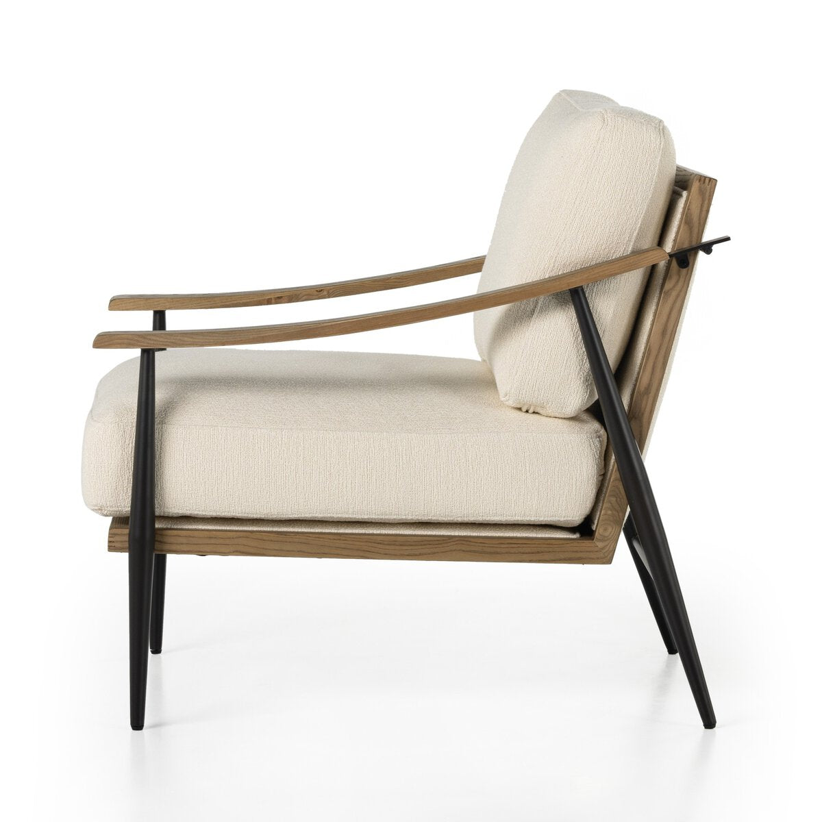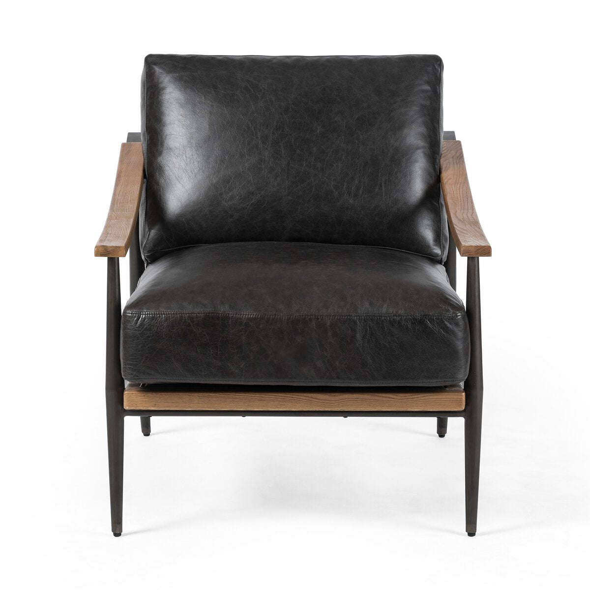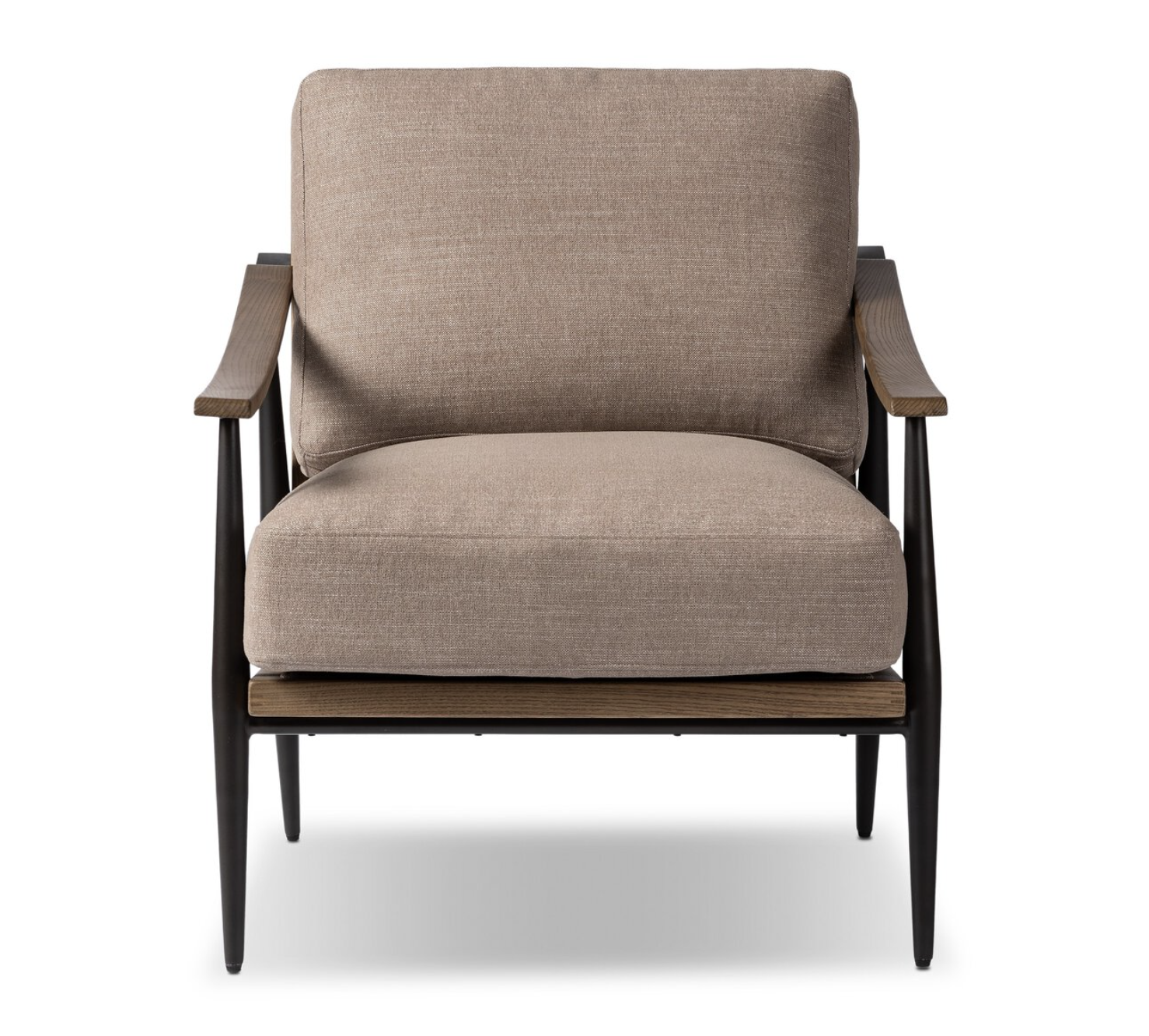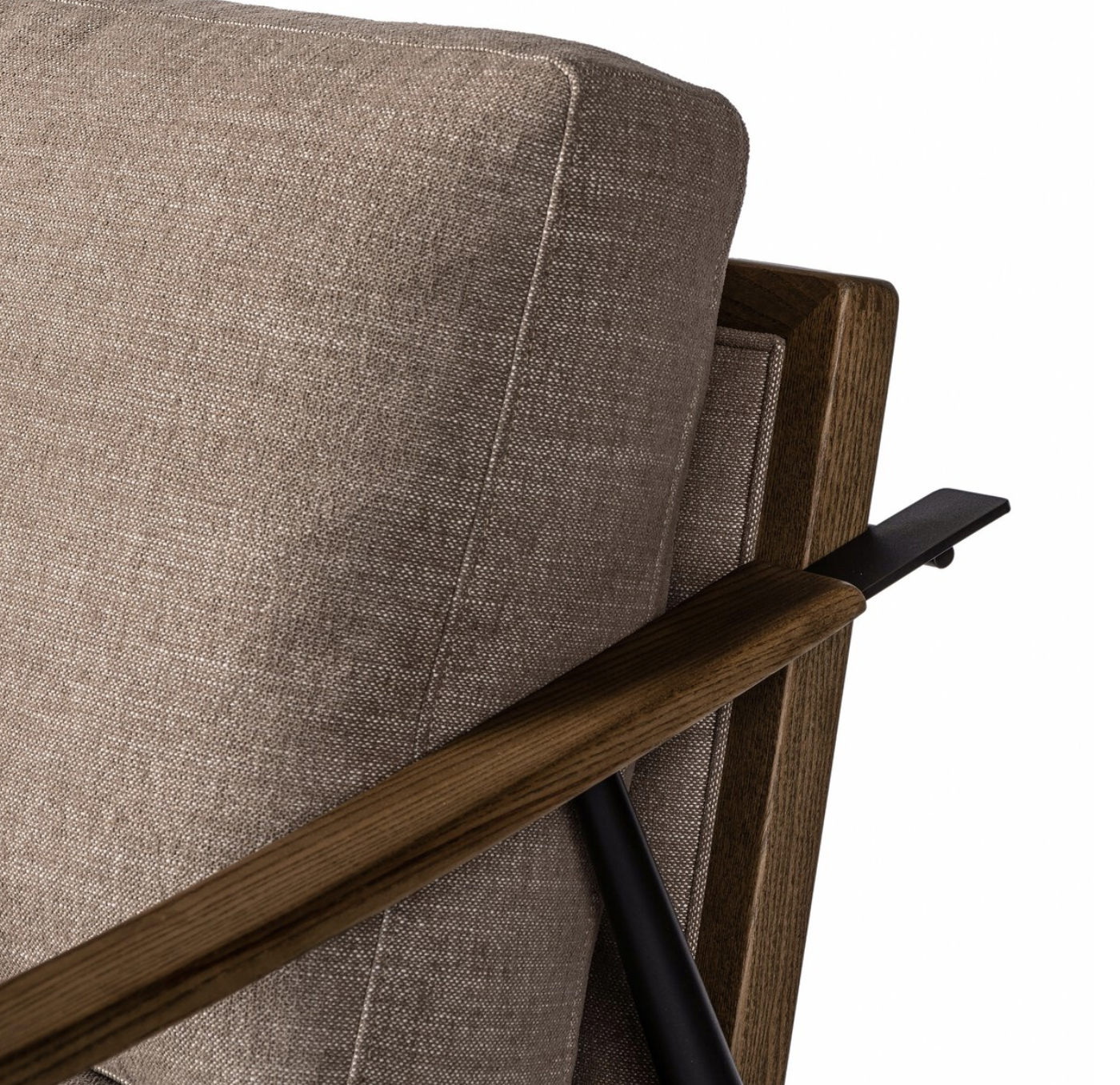Comfort and class in one chic silhouette. Sloped wooden arms and forged, gunmetal-finished legs frame cushy feather-blend seating covered in a textural grey twill, striking great tonal balance between warm and cool.
