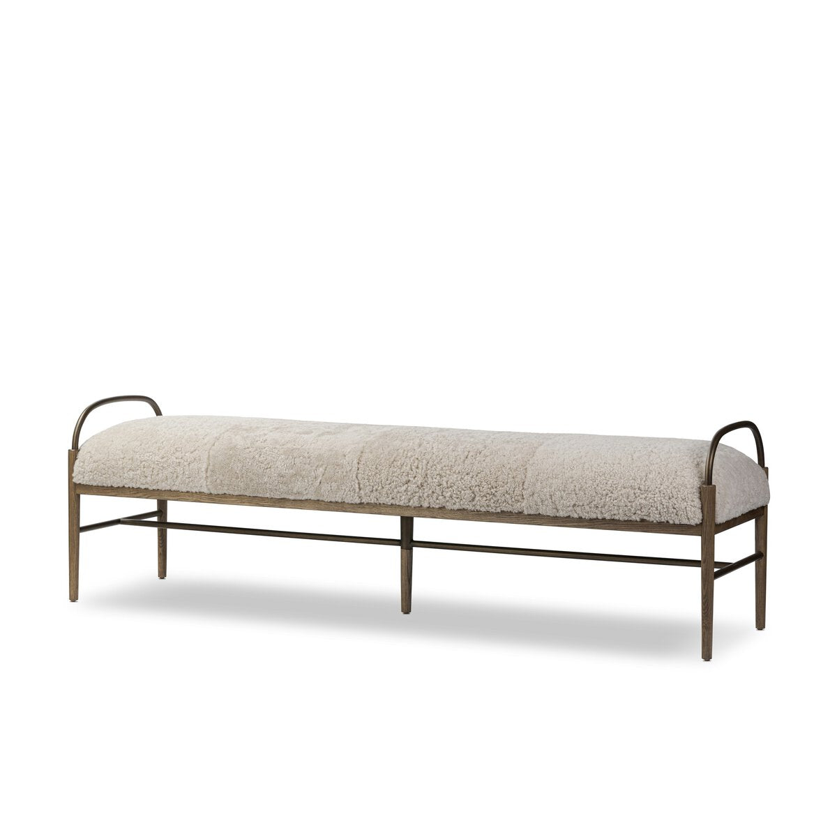 Curved brushed iron arms and an H-shaped stretcher pair with amber ash legs for a distinct material blend. Soft shearling provides a tactile contrast and warm, inviting feel. A design collaboration by Amber Lewis.