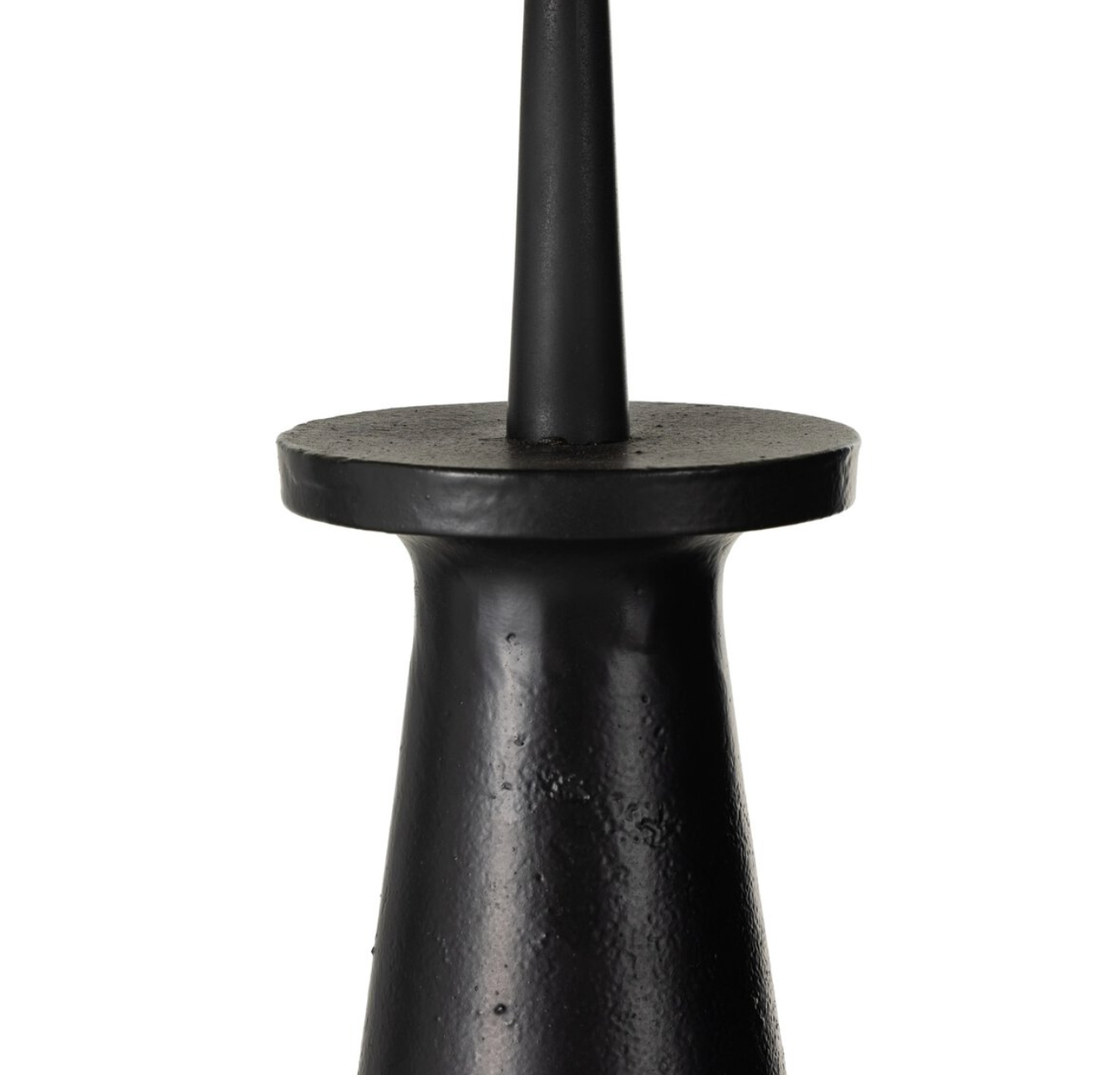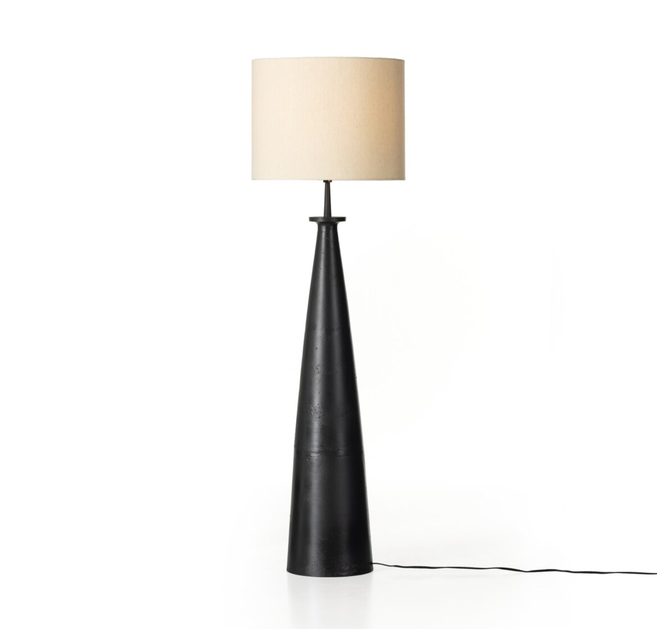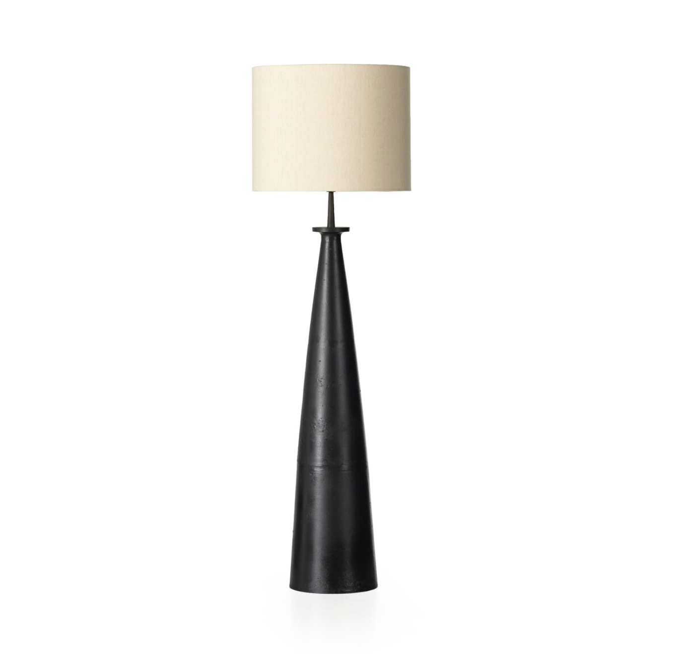 A striking sculptural piece featuring a beautifully shaped base of textured black aluminum paired with an off-white cotton shade for great contrast.