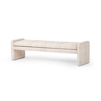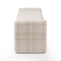 A traditional ivory fabric with a classic box pattern covers a long, sophisticated dining bench.