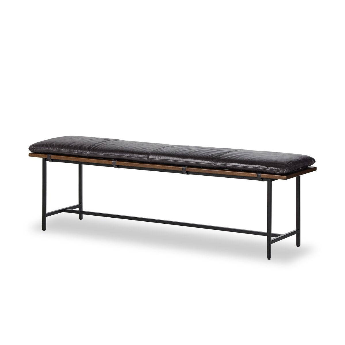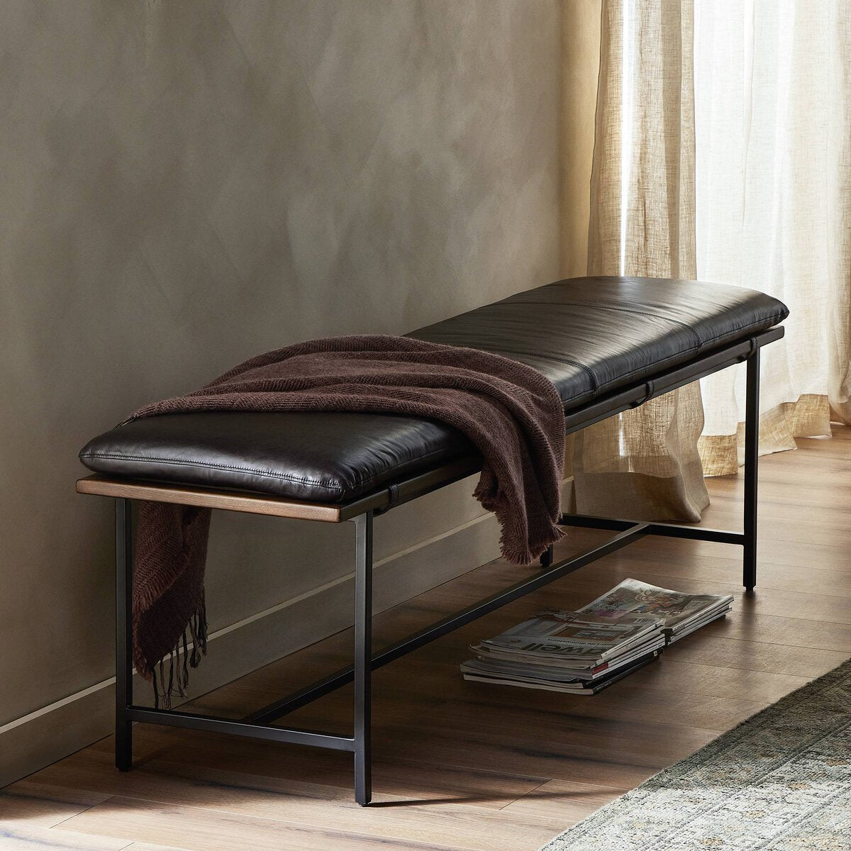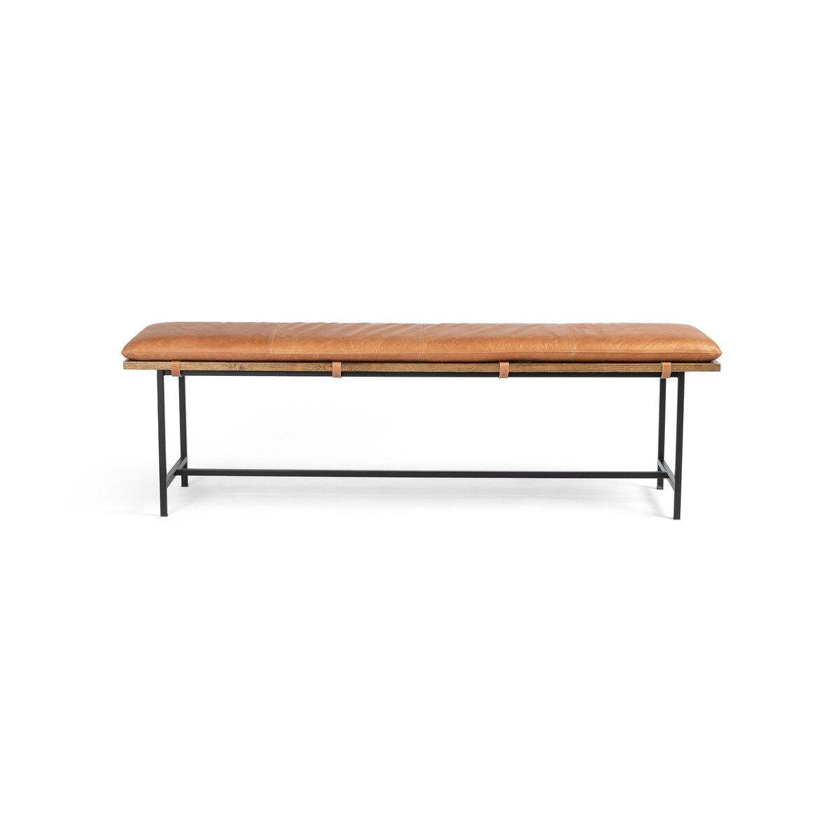 Fresh and transitional with effortless impact. Inspired by French antiques, airy, black-finished iron legs support a nettlewood dining bench with a chicly comfy layer of brandy top-grain leather seating that easily adheres via Velcro strapping.