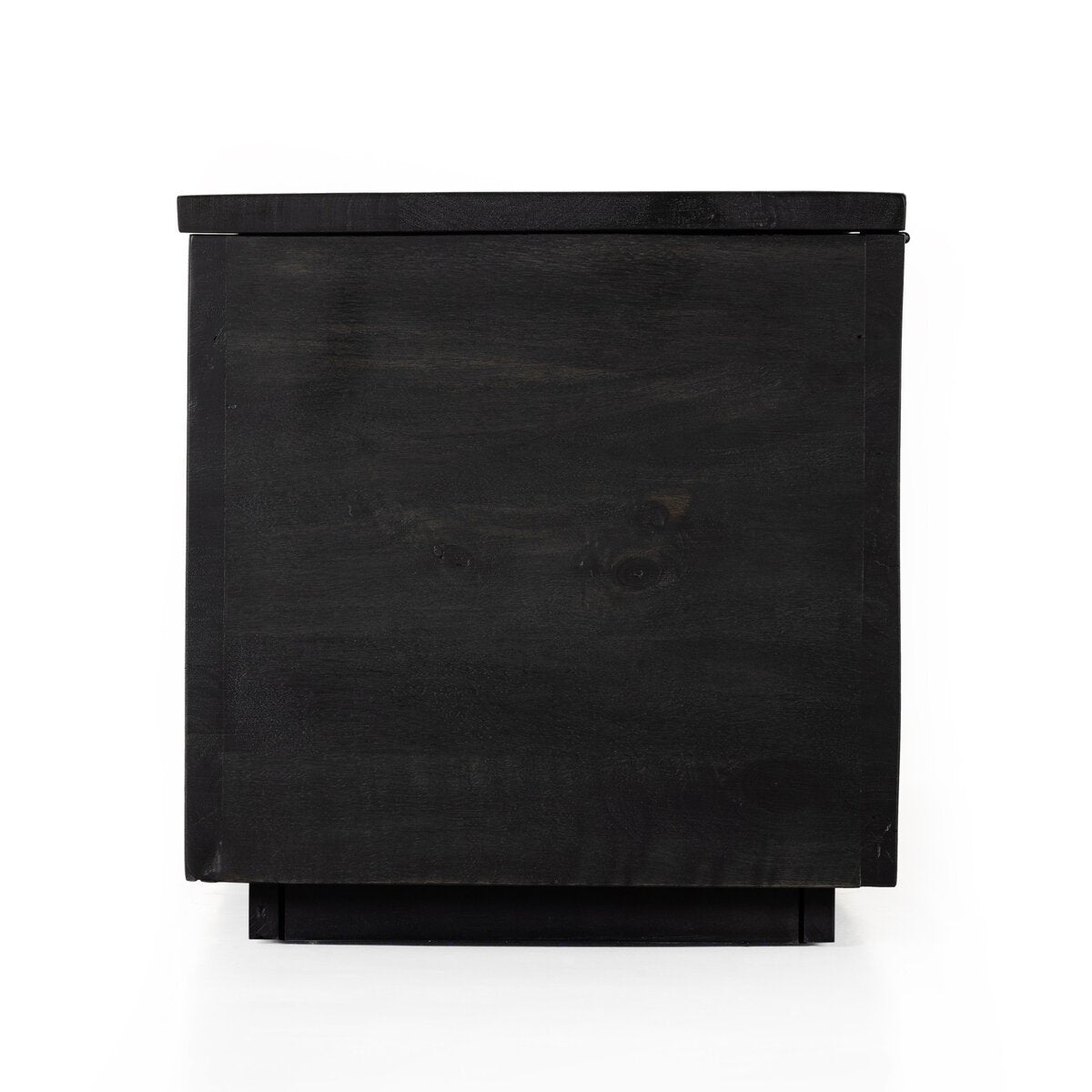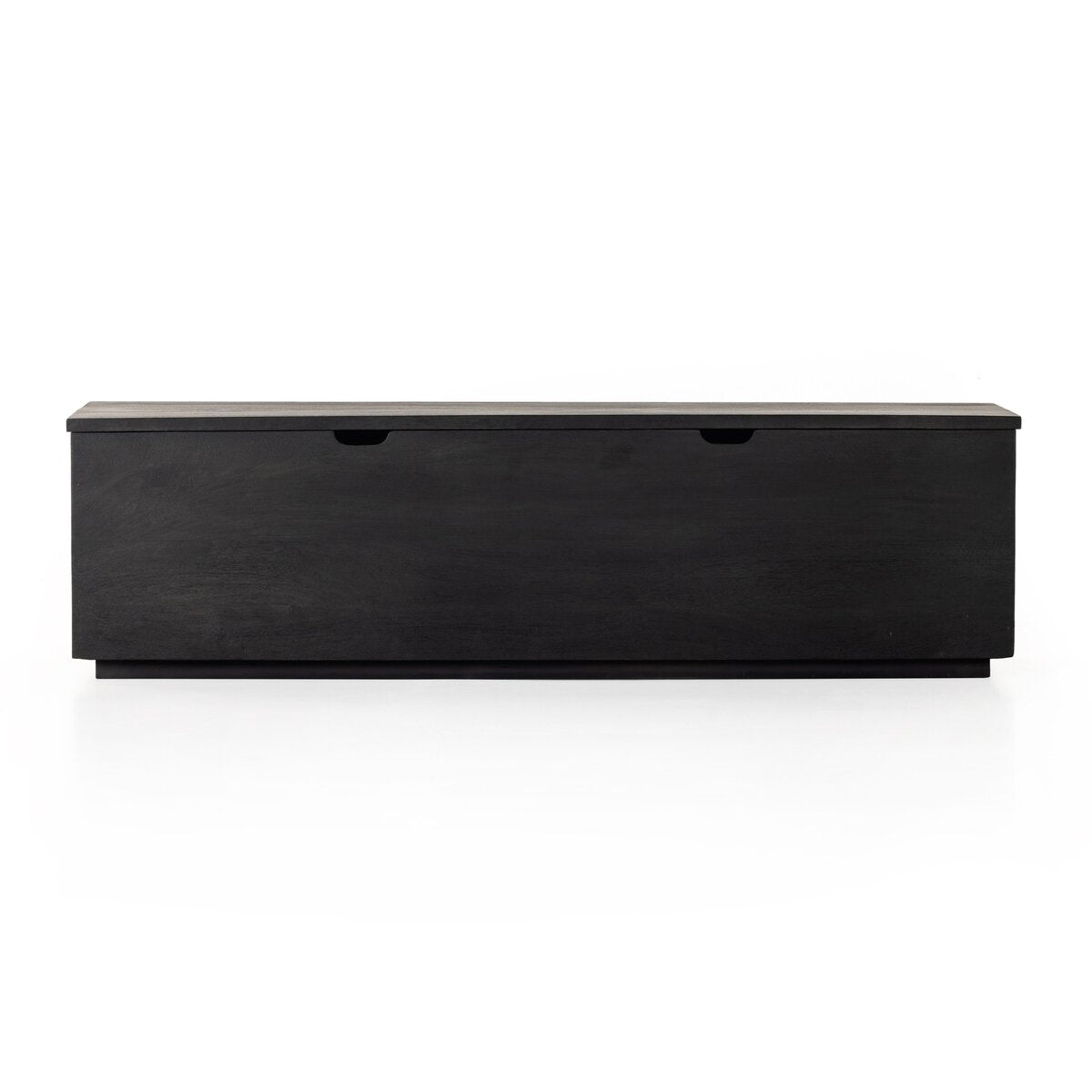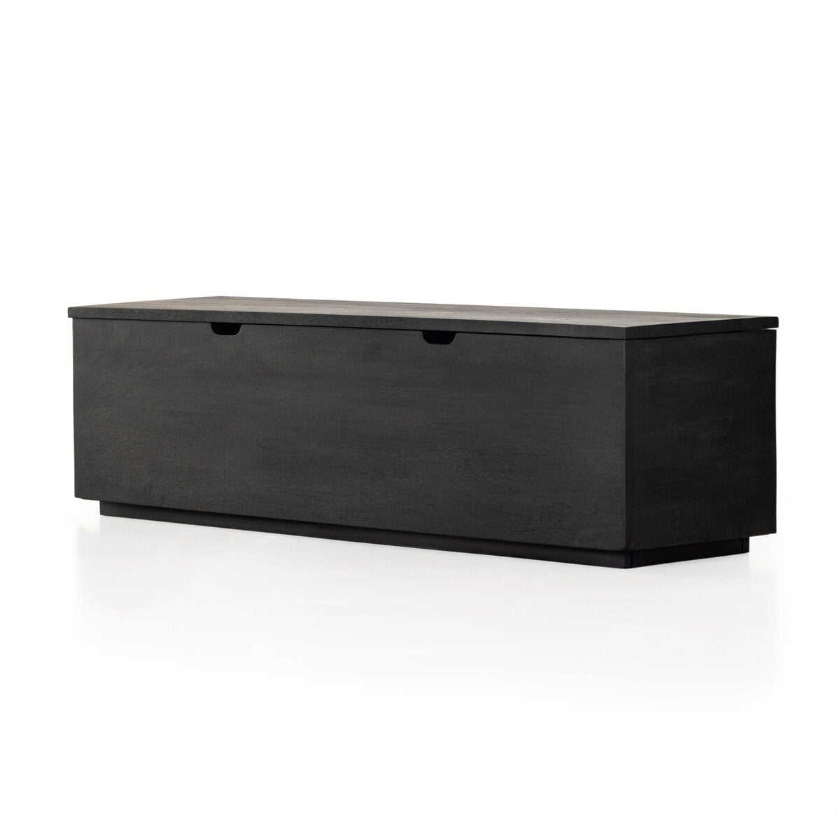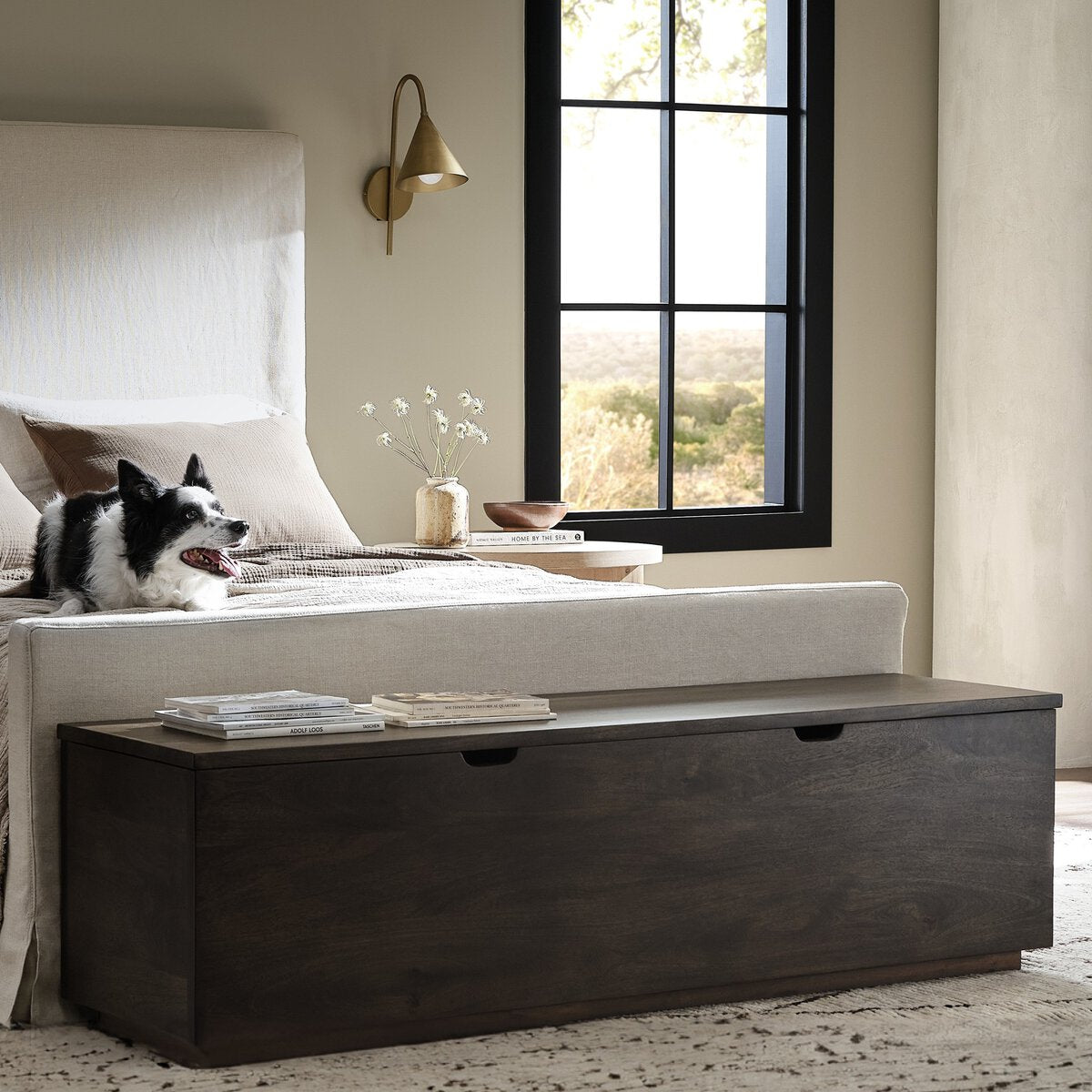 Rich, reclaimed woods deliver depth beyond streamlined shaping. Warm brown tones reveal natural knots and graining for a distinctively found feel. Spacious trunk space perfect in entryway or at the foot of the bed. Plinth base adds a modern touch.