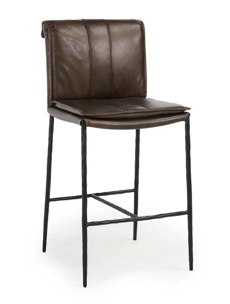 The Johnsville Counter Stool features luxurious top grain leather in a variety of rich shades, complemented by sleek hammered iron legs, offering a striking combination of comfort and industrial style. Perfect for your kitchen island or bar area, this stool brings both sleek functionality and design to your dining space. The durable leather provides a rich, textured feel, while the unique hammered iron legs add character and a touch of modern elegance. Ideal for creating a stylish and inviting atmosphere.