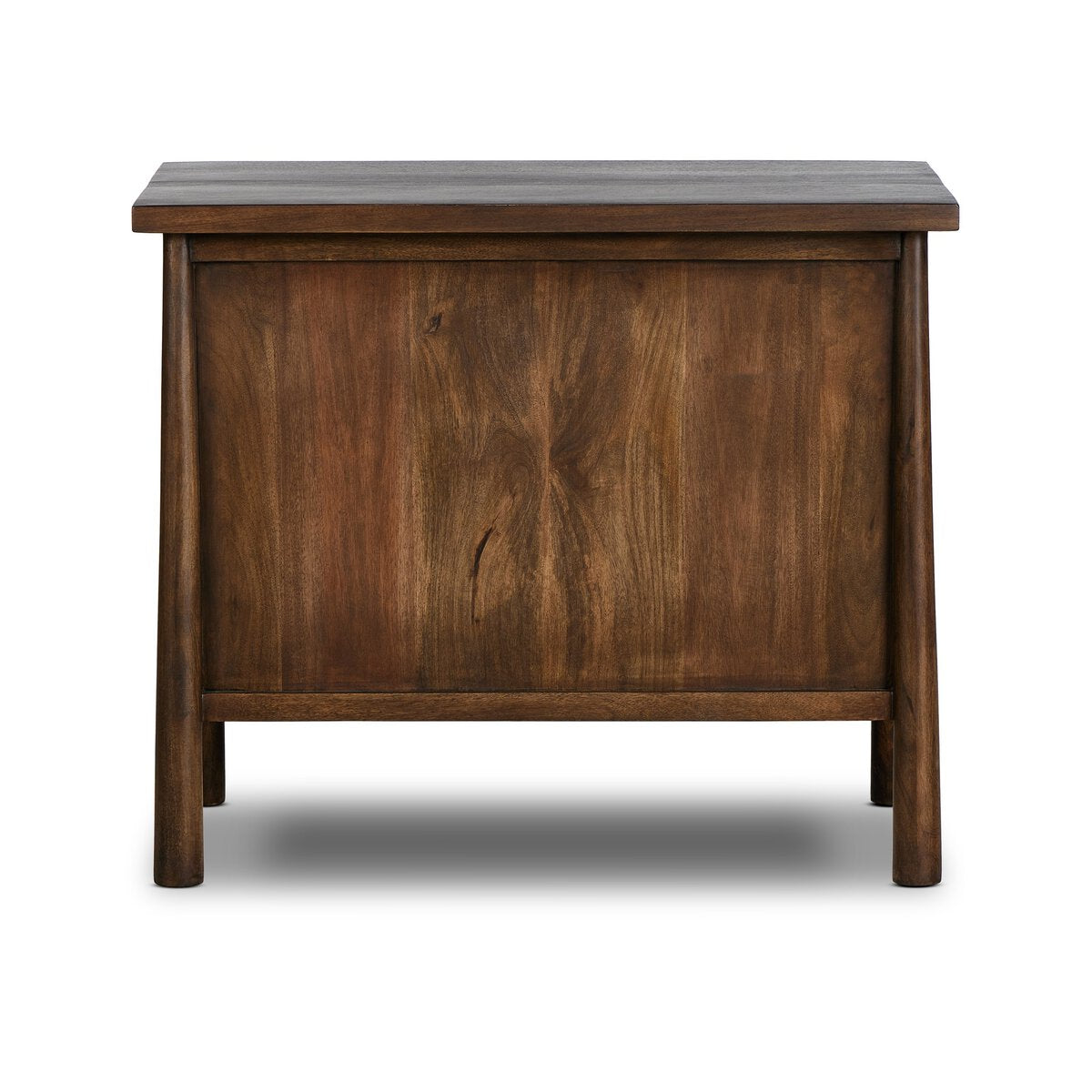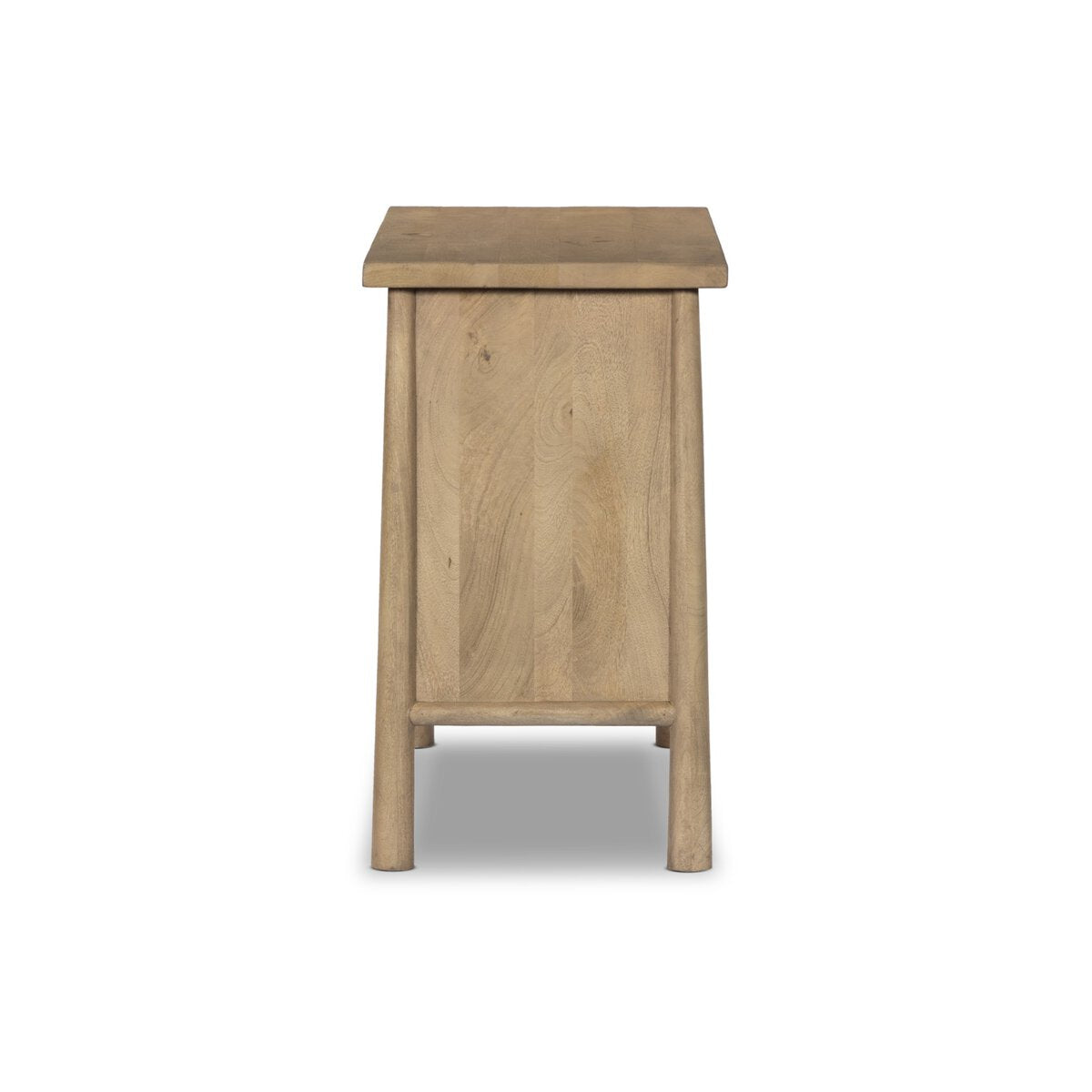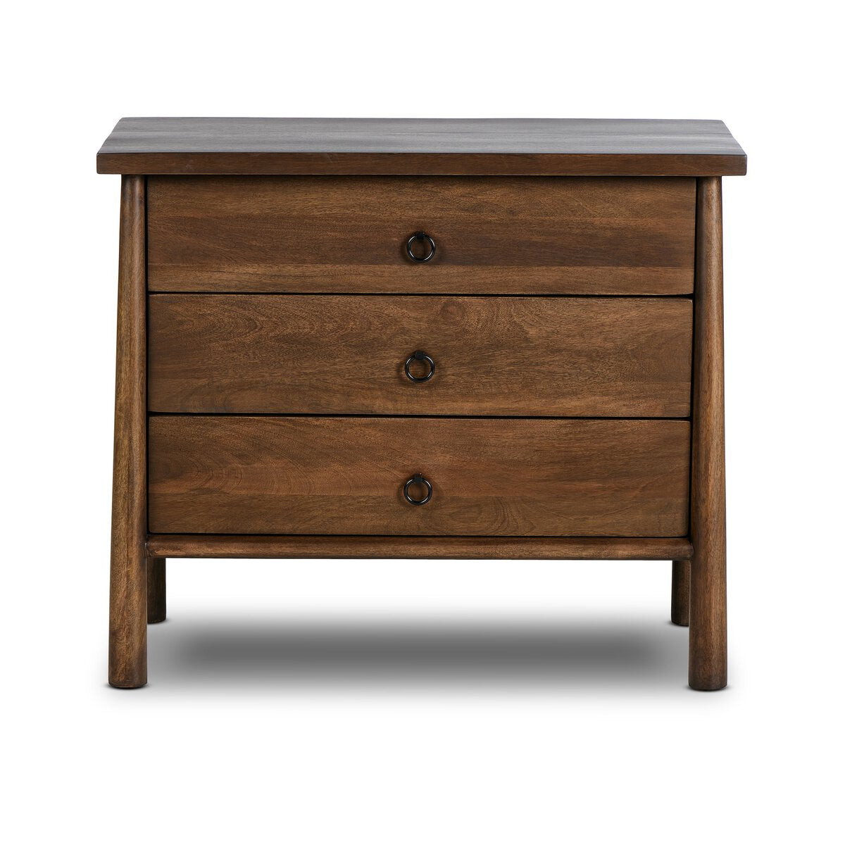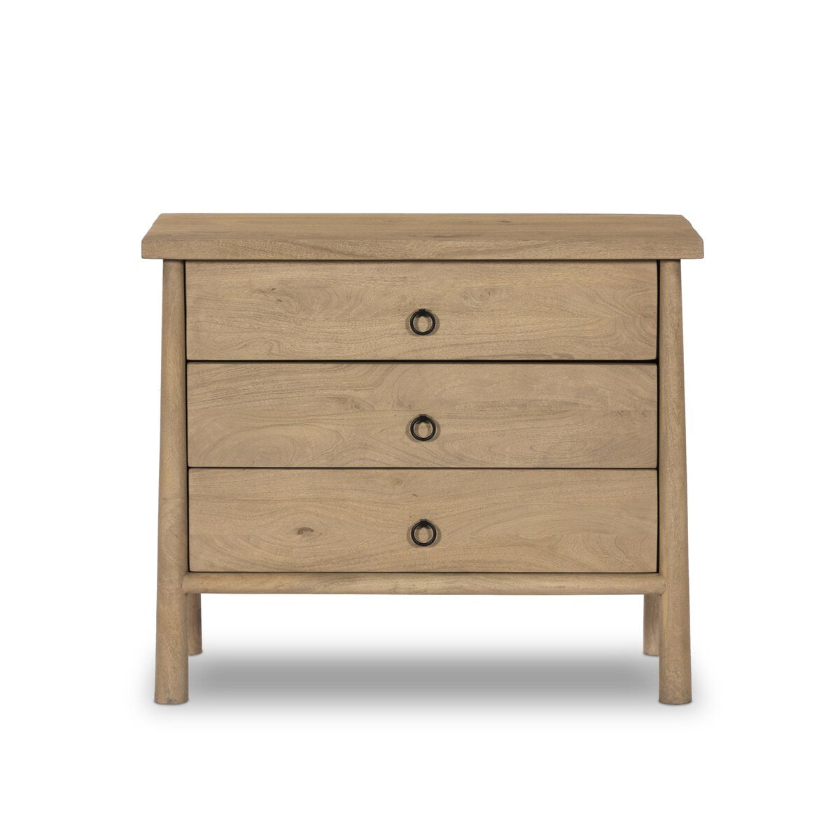 Inspired by French antique design, this dresser stands on round tapered legs with a prominent overhang top. Made of mango wood with cast iron key ring pulls, three drawers make it a versatile choice as a dresser or nightstand.