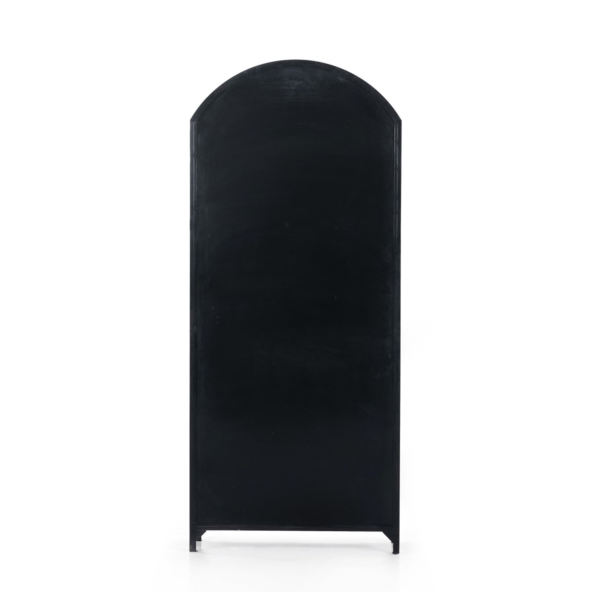 Display barware, books and keepsakes in beautifully arched cabinetry. Solid iron sheeting is finished in a soft, matte black with contrasting brass hardware. Glass fronts allow back paneling of light oak veneer to show, for an eye-catching contrast of color.
