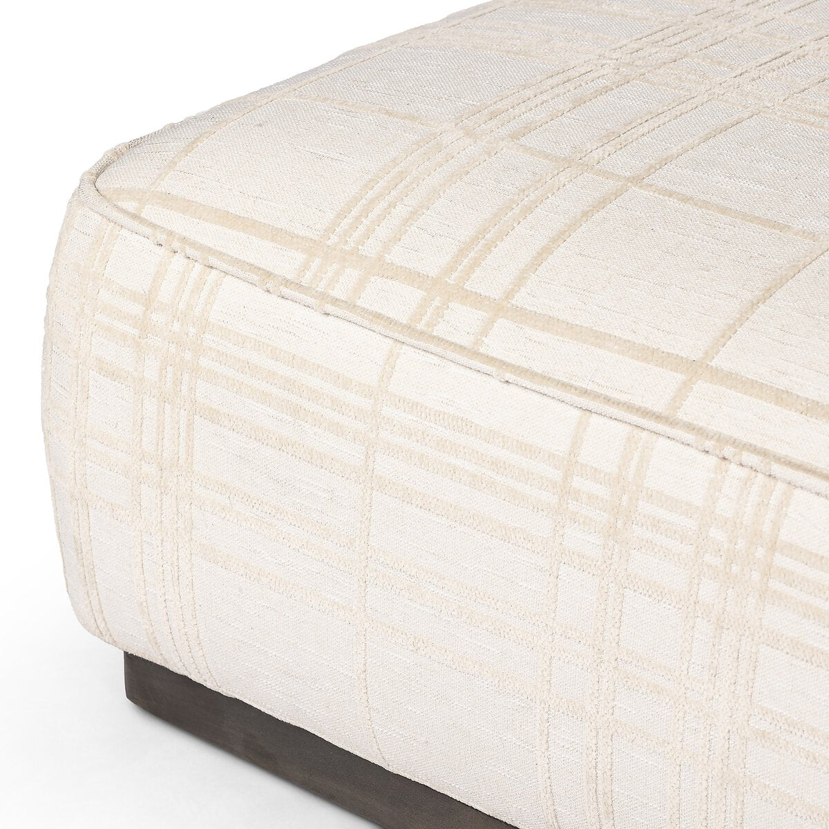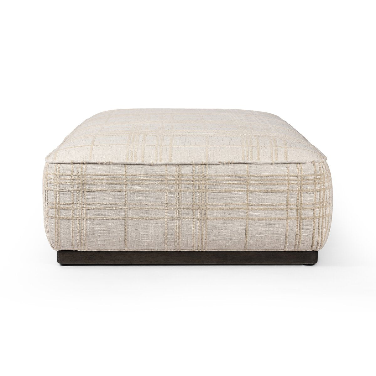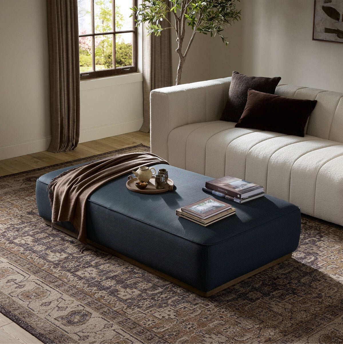 Upholstered in a chunky, textural boucle performance fabric and paired with a subtly distressed parawood base, this large, rectangular ottoman can be placed just about anywhere bringing with it a retro vibe. Style with a tray as a design-forward coffee table. Performance fabrics are specially created to withstand spills, stains, high traffic and wear, ensuring long-term comfort and unmatched durability.
