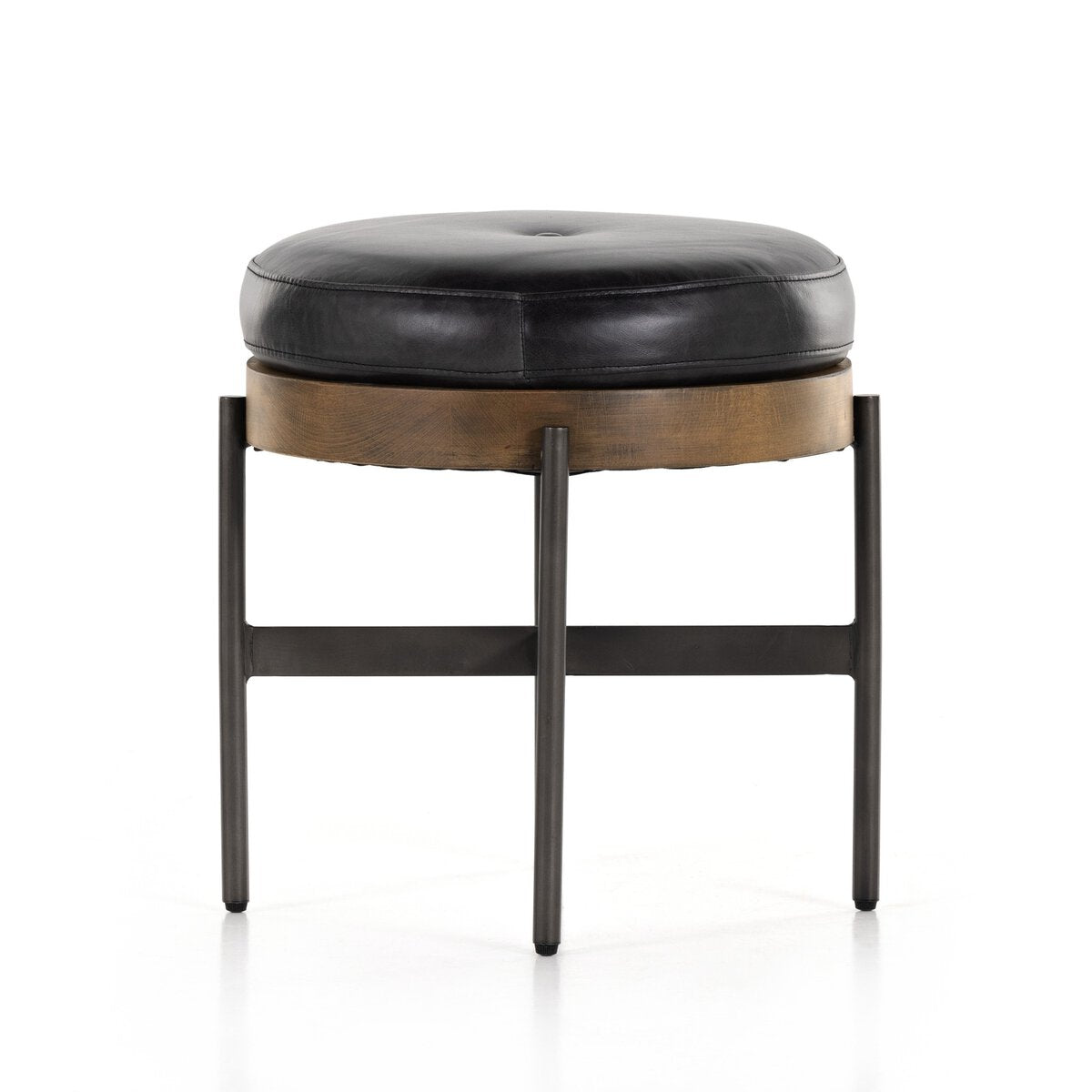 Stylish versatility. An airy base of gunmetal-finished iron supports rounded beech wood with textural wheat-colored upholstery. Perfectly scaled for use as an end table or as quick extra seating.