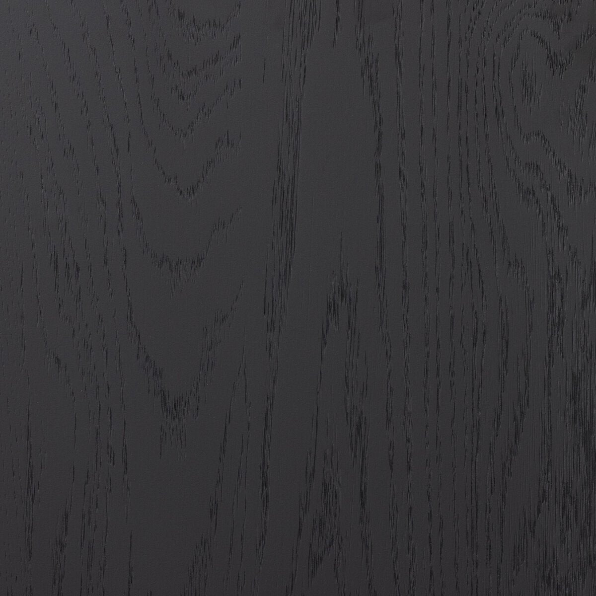 Black drifted oak frames lighter interior shelving for subtle but striking contrast. Glass doors allow for prized possessions to dazzle on display. Rear cutout for cord management.