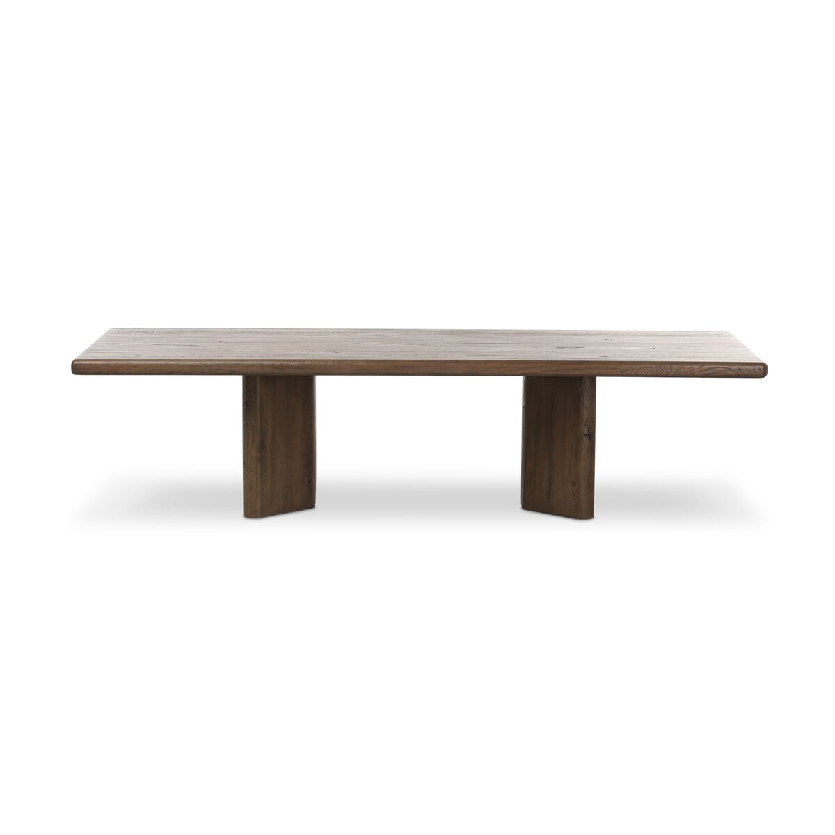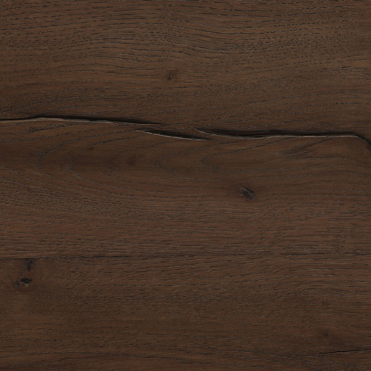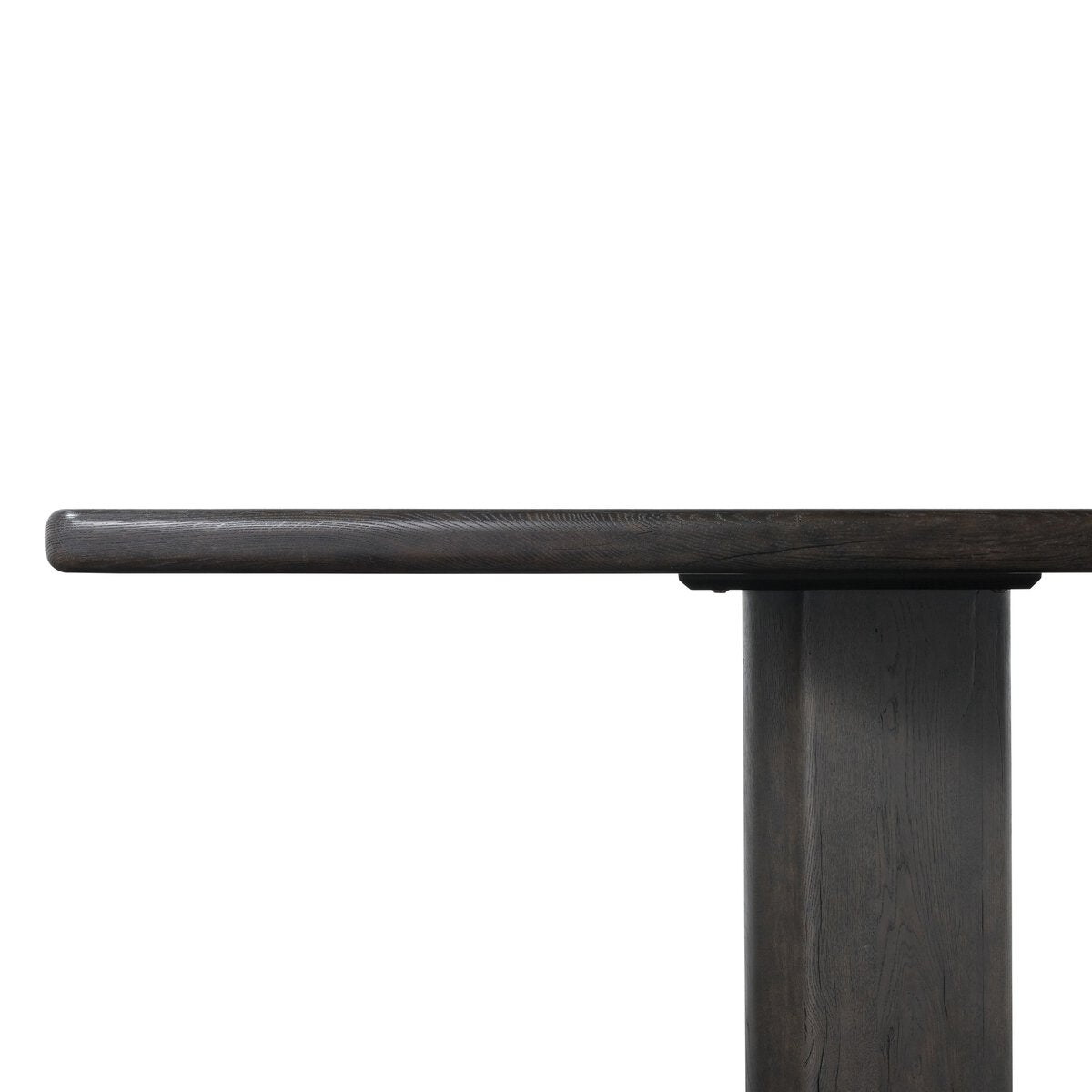 Designed in partnership with Thomas Bina and Brazilian designer Ronald Sasson, a grand-scale dining table is made from solid reclaimed French oak finished in a deep espresso. Rounded edges add a softer, fluid look. Seats 12.
