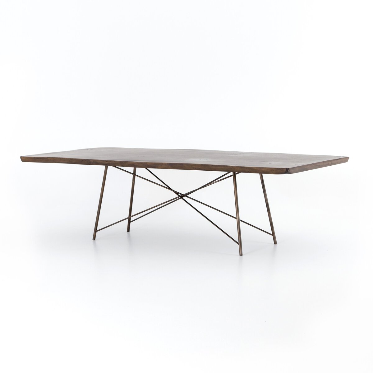 X marks the spot. A bronzed iron base strikes a spare, geo-inspired shape to support a top of smoked saman, bringing an intriguing contrast of texture and trend to the dining table.