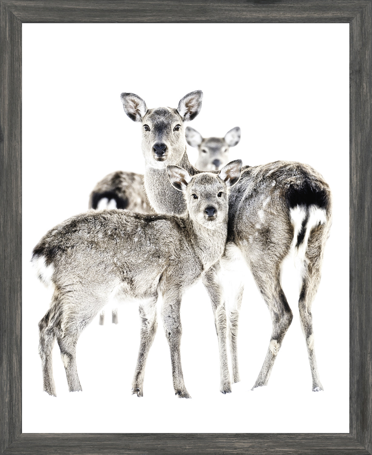 All is still in this beautiful best selling photograph of a mother deer and its two fawns. She is watching, and invites you to sit and enjoy the calm of this woodland scene captured against a pristine white ground.