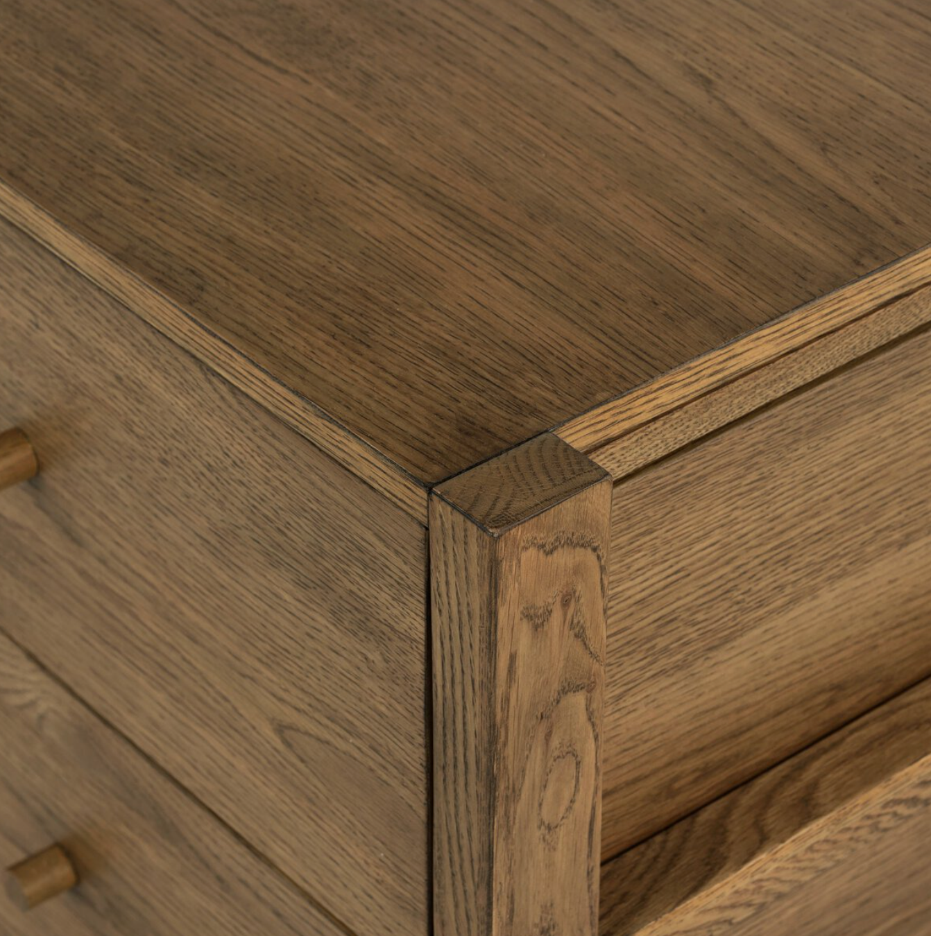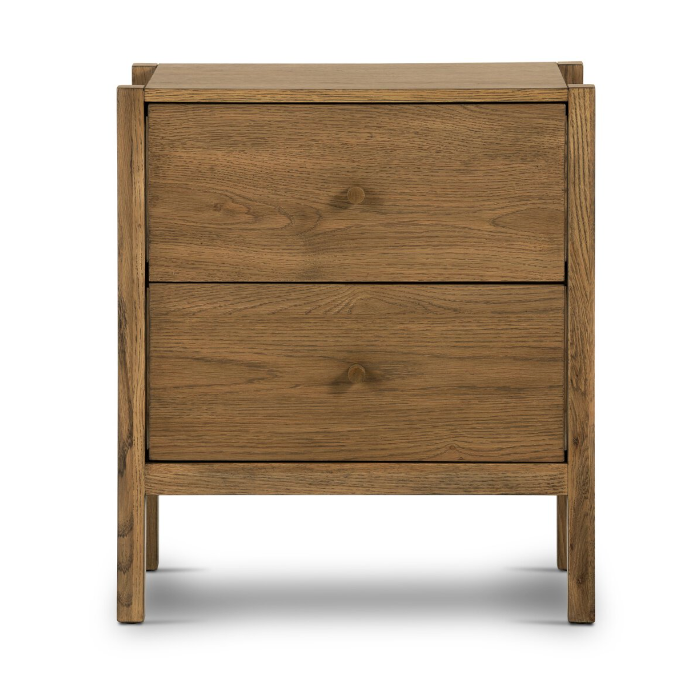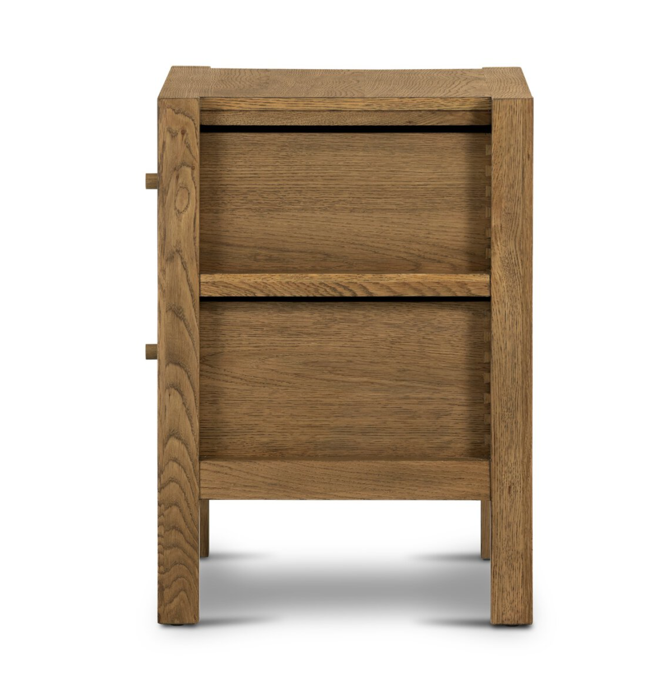 With simple shaping inspired by midcentury casing, exposed framework and a warm oak finish bring a handcrafted, minimalist look to stylish bedside storage.