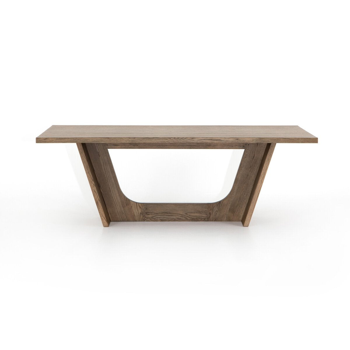 An angular V base and mirrored stretcher speak to the modern point of view behind this stately design. Crafted from thick oak veneers, a mix of straight and cathedral grains plus a smoky grey finish bring depth to the dining table. Seats 8.