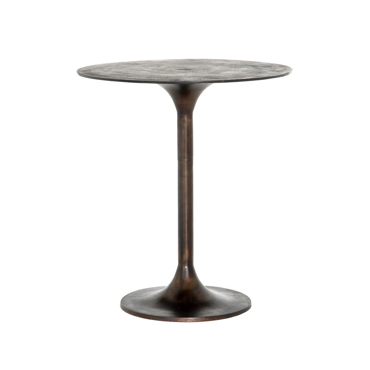 Classic tulip shaping in textural cast-aluminum makes for a modern pub table. Finished in antique rust to bring out alluring highs and lows. Great indoors or out, cover or store indoors during inclement weather and when not in use.
