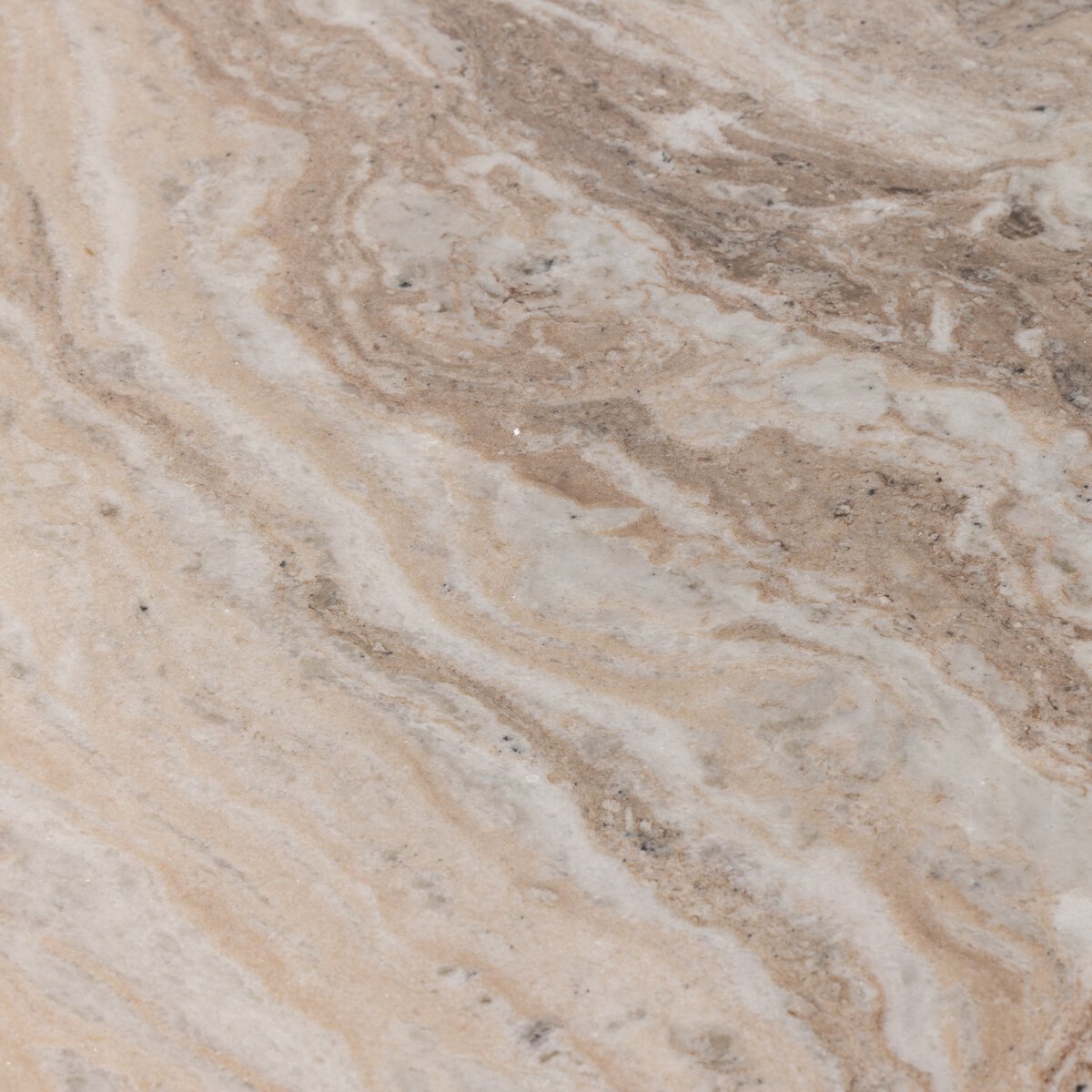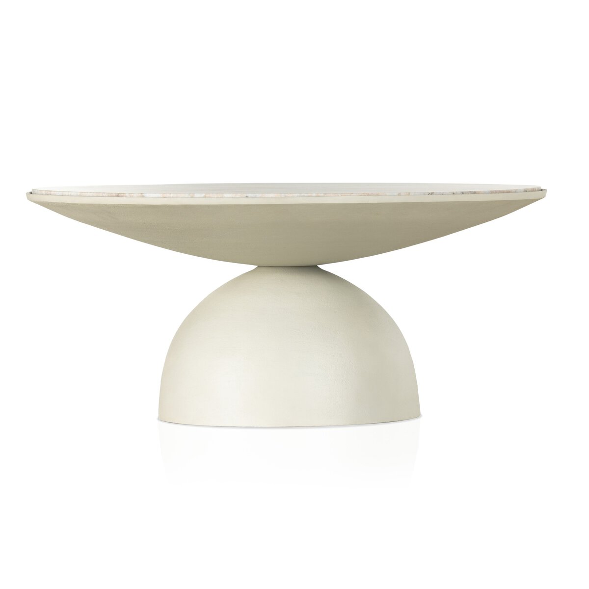 For a sculptural play on shape, a hammered grey aluminum base supports a large, rounded tabletop of creamy taupe solid marble with swirls of natural veining.