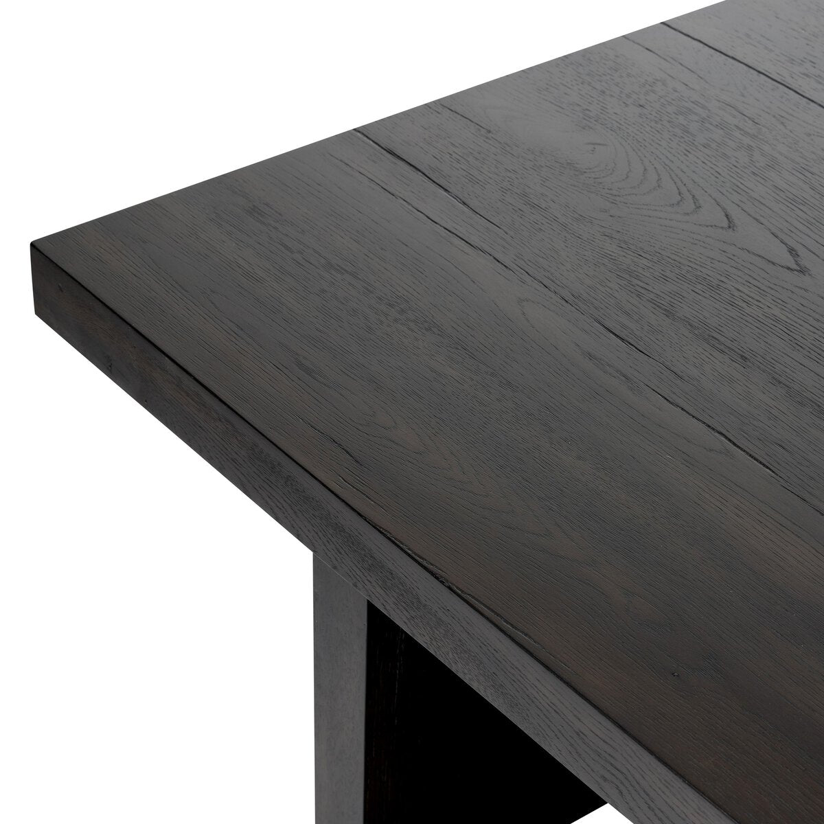 A substantially sized coffee table of oak features joint and connection construction for a design-forward look. Visible knots and graining add character.