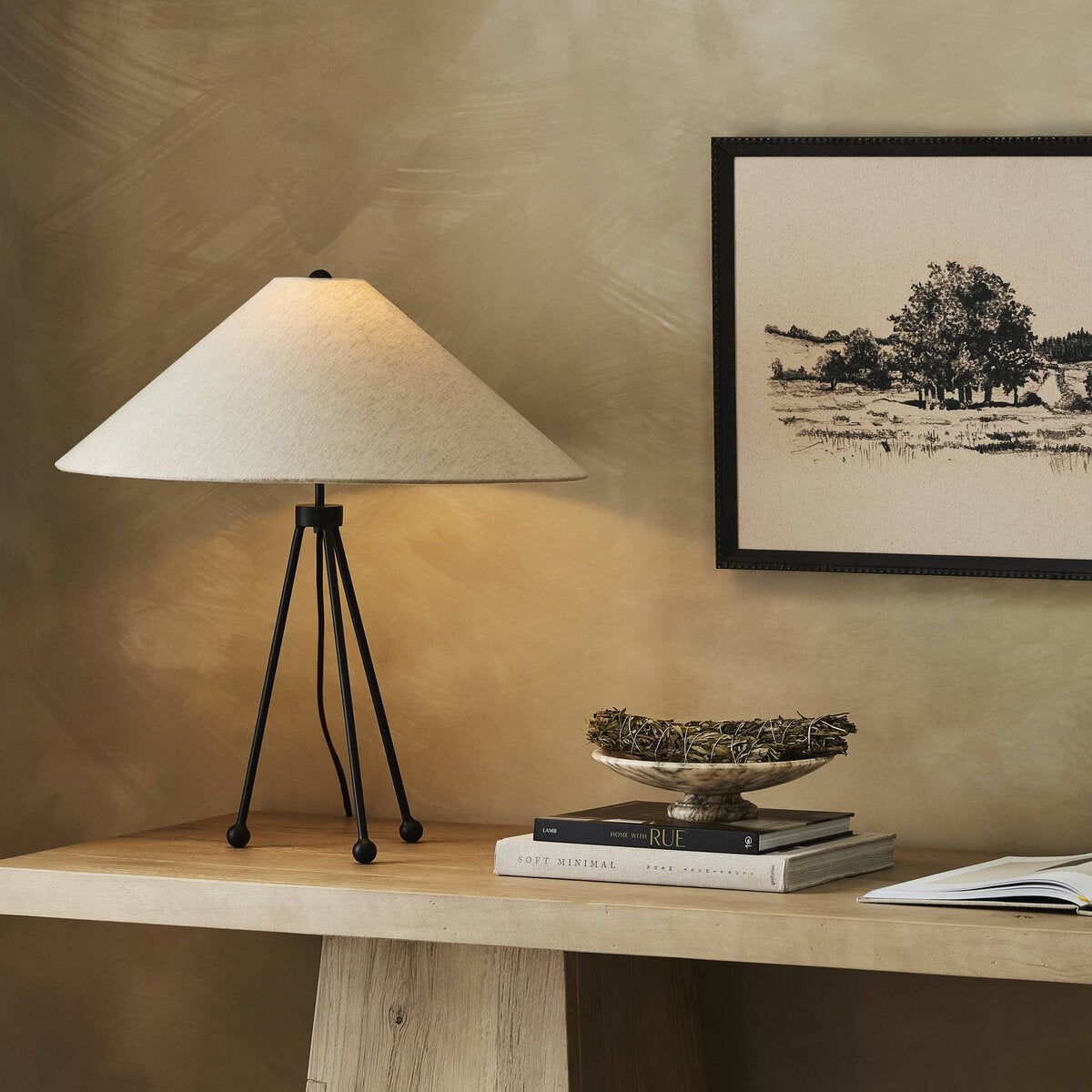 An exaggeratedly slim, tall, airy base of black-finished iron supports a light beige shade of 100% cotton, for a classic look with contrast.
