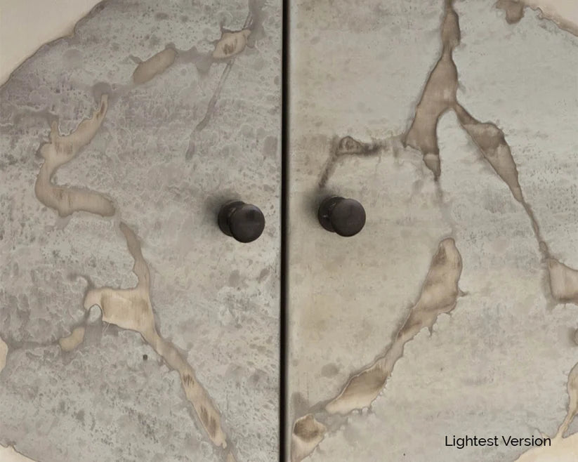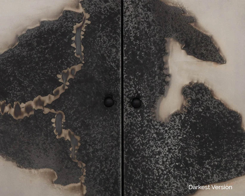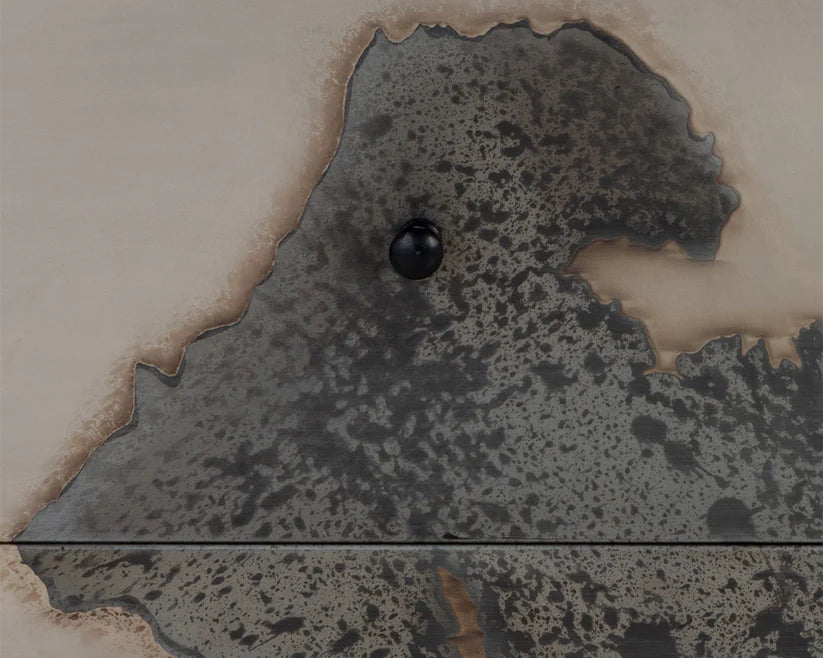 Make a bold statement with this unique nightstand. The drawers feature a one-of-a-kind patina finish, boldly contrasted with a black iron frame. Made in India. With refined craftsmanship, this design was brought to life by skilled local artisans. By nature, these materials develop unique imperfections such as markings and color variations for a truly one-of-a-kind piece. Pictures shown reflect the lightest and darkest variations of our Arlington patina finish. Actual product may range between these finishes.