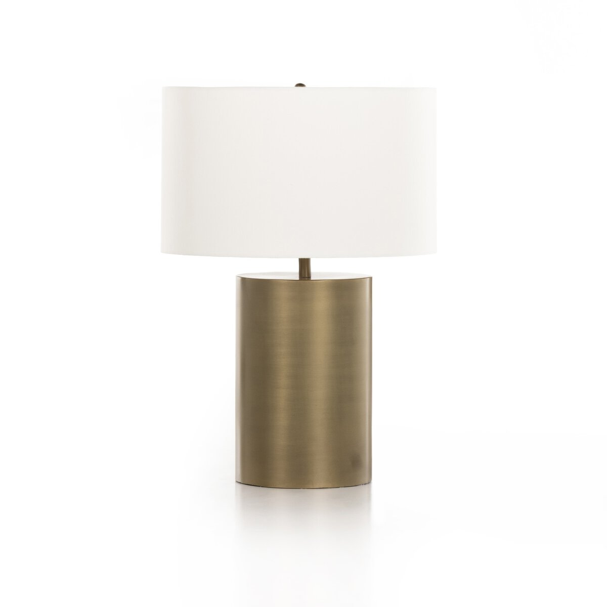 A light antique brass finish lends art deco vibes to this cylindrical table lamp. A white silk shade plays up this fresh mixing of materials.