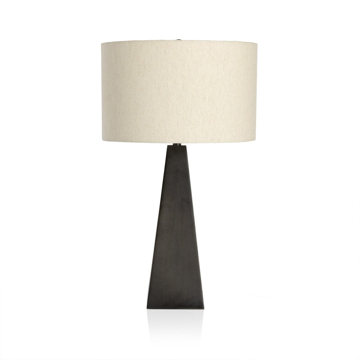 Bring a tonal touch to the desktop or bedside, with a pyramid-style base finished in light antique brass then paired with a beige cotton shade.