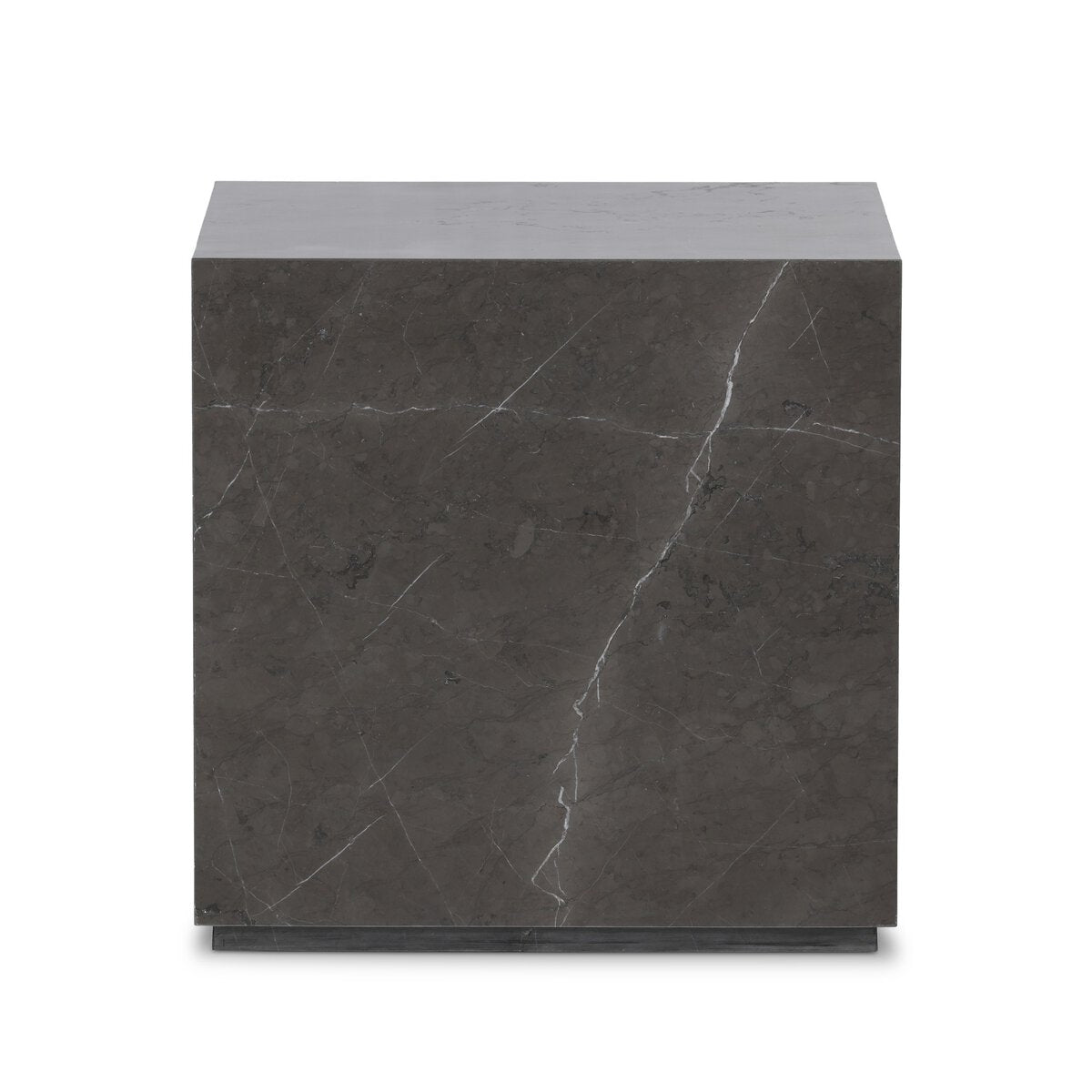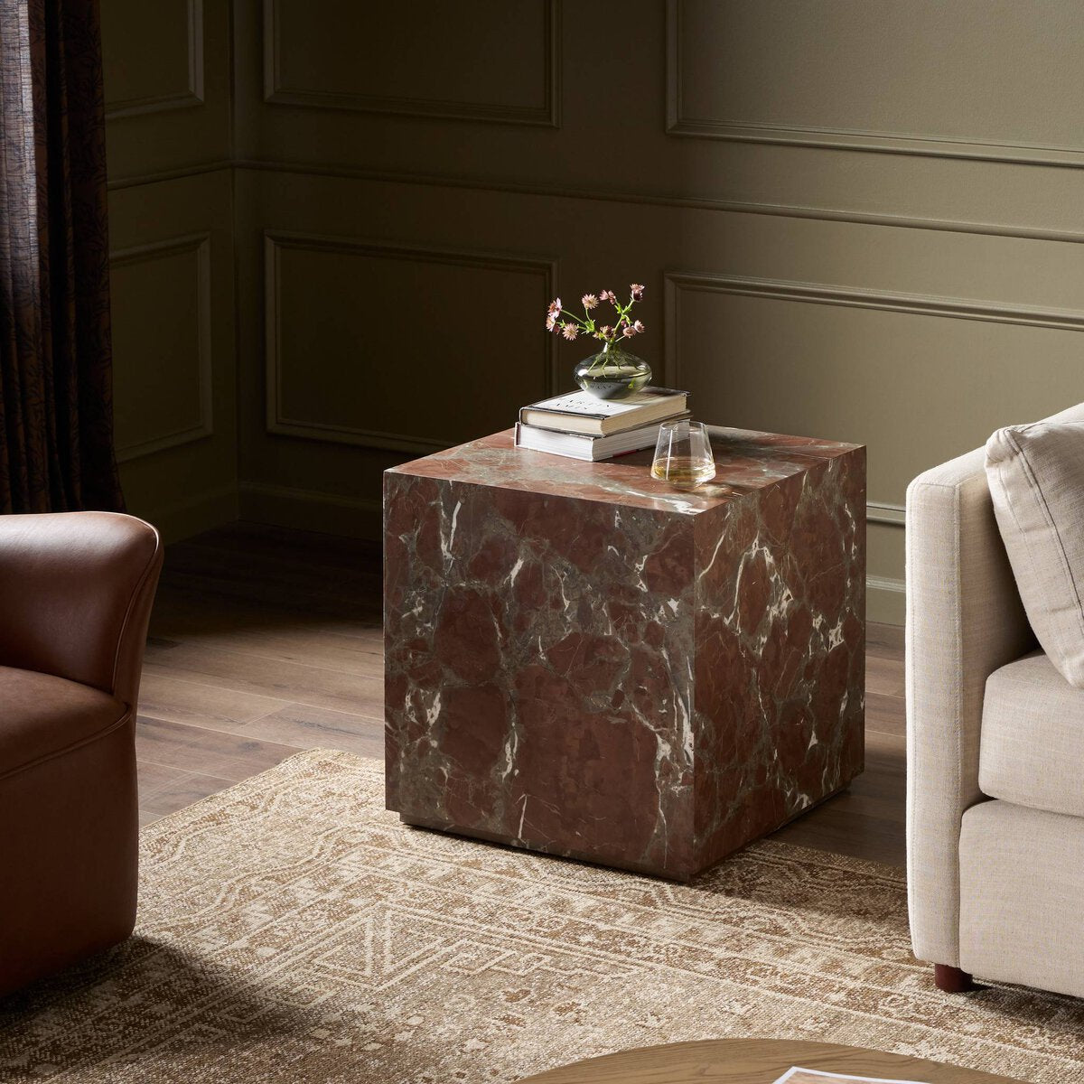Taupe marble shapes a cubed, plinth-style end table that can be styled just about anywhere.