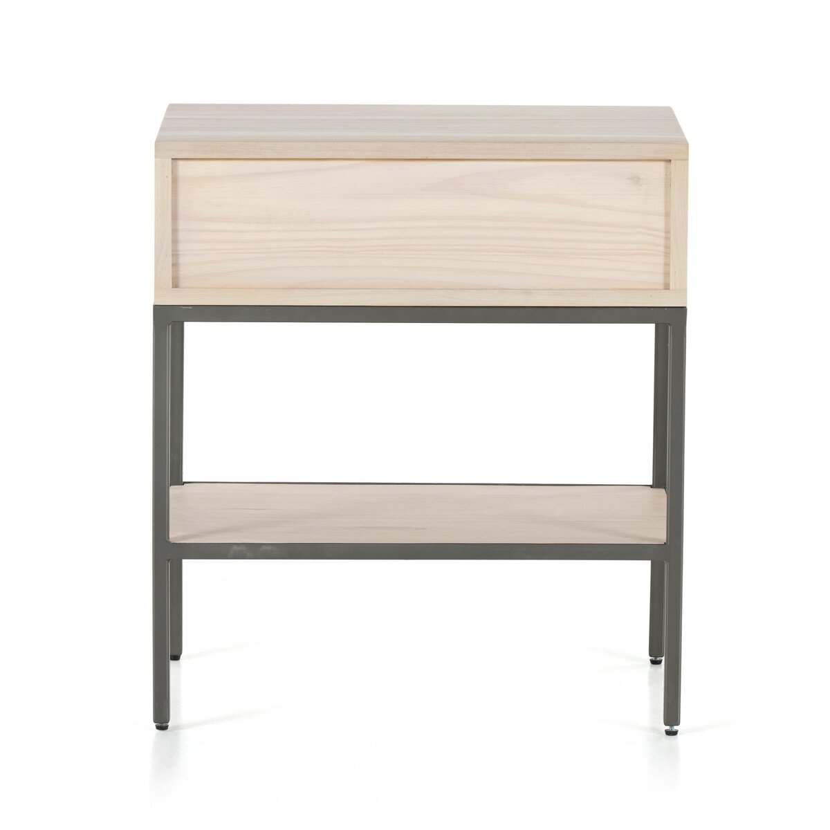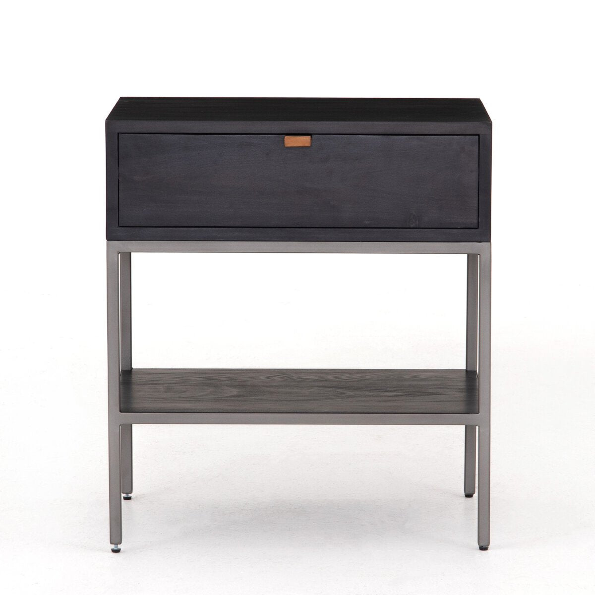 Inspired by clean mid-century design, a stylish nightstand of dove, auburn, or solid black-washed poplar brings extra space to bedside storage. Metal-secured leather pull adds a textural element of surprise.